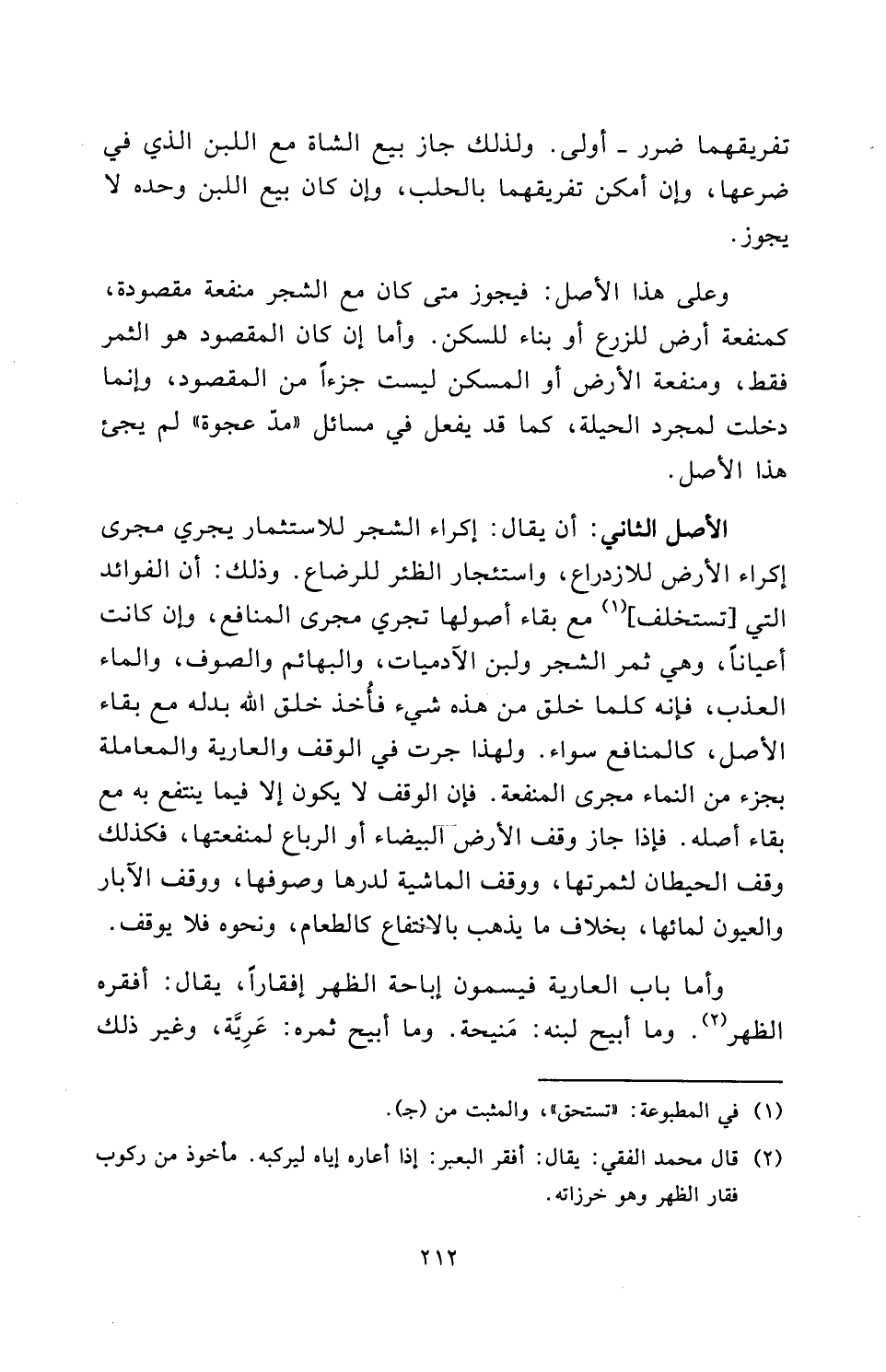 الْأَصْلُ الثَّانِي: أَنْ يُقَالَ: إِكْرَاءُ الشَّجَرِ لِلِاسْتِثْمَارِ يَجْرِي مَجْرَى إِكْرَاءِ الْأَرْضِ لِلِازْدِرَاعِ، وَاسْتِئْجَارُ الظِّئْرِ لِلرِّضَاعِ، وَذَلِكَ: أَنَّ الْفَوَائِدَ الَّتِي [تُسْتَخْلَفُ] مَعَ بَقَاءِ أُصُولِهَا تَجْرِي مَجْرَى الْمَنَافِعِ، وَإِنْ كَانَتْ أَعْيَانًا، وَهِيَ ثَمَرُ الشَّجَرِ وَلَبَنُ الْآدَمِيَّاتِ، وَالْبَهَائِمُ وَالصُّوفُ، وَالْمَاءُ الْعَذْبُ، فَإِنَّهُ كُلَّمَا خَلَقَ مِنْ هَذِهِ شَيْءٌ فَأُخِذَ، خَلَقَ اللَّهِ بَدَلَهُ مَعَ بَقَاءِ الْأَصْلِ، كَالْمَنَافِعِ سَوَاءٌ، وَلِهَذَا جَرَتْ فِي الْوَقْفِ وَالْعَارِيَةِ وَالْمُعَامَلَةِ بِجُزْءٍ مِنَ النَّمَاءِ مَجْرَى الْمَنْفَعَةِ، فَإِنَّ الْوَقْفَ لَا يَكُونُ إِلَّا فِيمَا يَنْتَفِعُ بِهِ مَعَ بَقَاءِ أَصْلِهِ، فَإِذَا جَازَ وَقْفُ الْأَرْضِ الْبَيْضَاءِ أَوِ الرِّبَاعِ لِمَنْفَعَتِهَا، فَكَذَلِكَ وَقْفُ الْحِيطَانِ لِثَمَرَتِهَا، وَوَقْفُ الْمَاشِيَةِ لِدَرِّهَا وَصُوفِهَا، وَوَقْفُ الْآبَارِ وَالْعُيُونِ لِمَائِهَا، بِخِلَافِ مَا يَذْهَبُ بِالِانْتِفَاعِ كَالطَّعَامِ، وَنَحْوِهِ فَلَا يُوقَفُ.