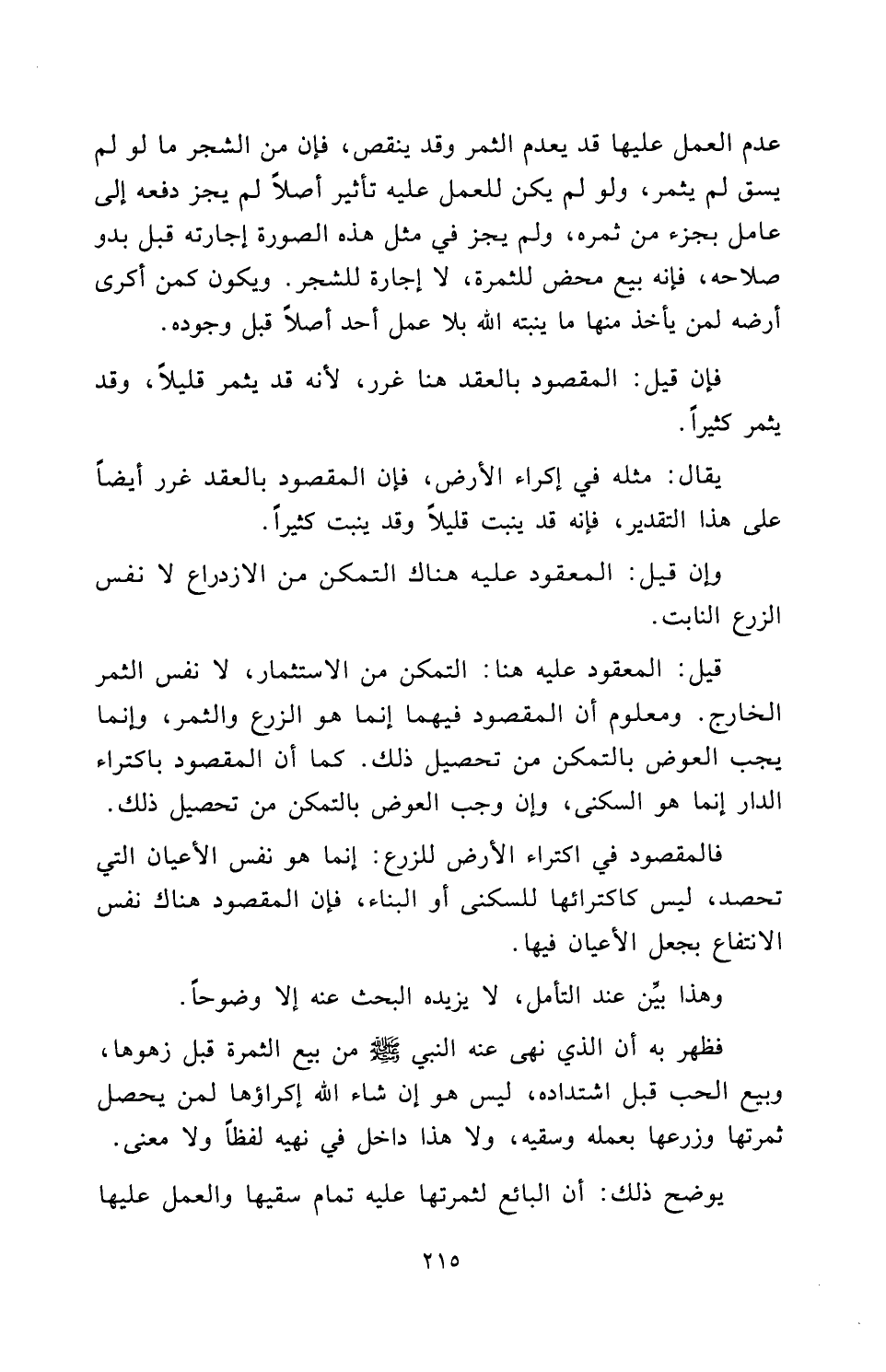 فَظَهَرَ بِهِ أَنَّ الَّذِي نَهَى عَنْهُ النَّبِيُّ - صَلَّى اللَّهُ عَلَيْهِ وَسَلَّمَ - مِنْ بَيْعِ الثَّمَرَةِ قَبْلَ زُهُوِّهَا، وَبَيْعِ الْحَبِّ قَبْلَ اشْتِدَادِهِ، لَيْسَ هُوَ إِنْ شَاءَ اللَّهُ إِكْرَاؤُهَا لِمَنْ يُحَصِّلُ ثَمَرَتَهَا وَزَرْعَهَا بِعَمَلِهِ وَسَقْيِهِ، وَلَا هَذَا دَاخِلٌ فِي نَهْيِهِ لَفْظًا وَلَا مَعْنًى.