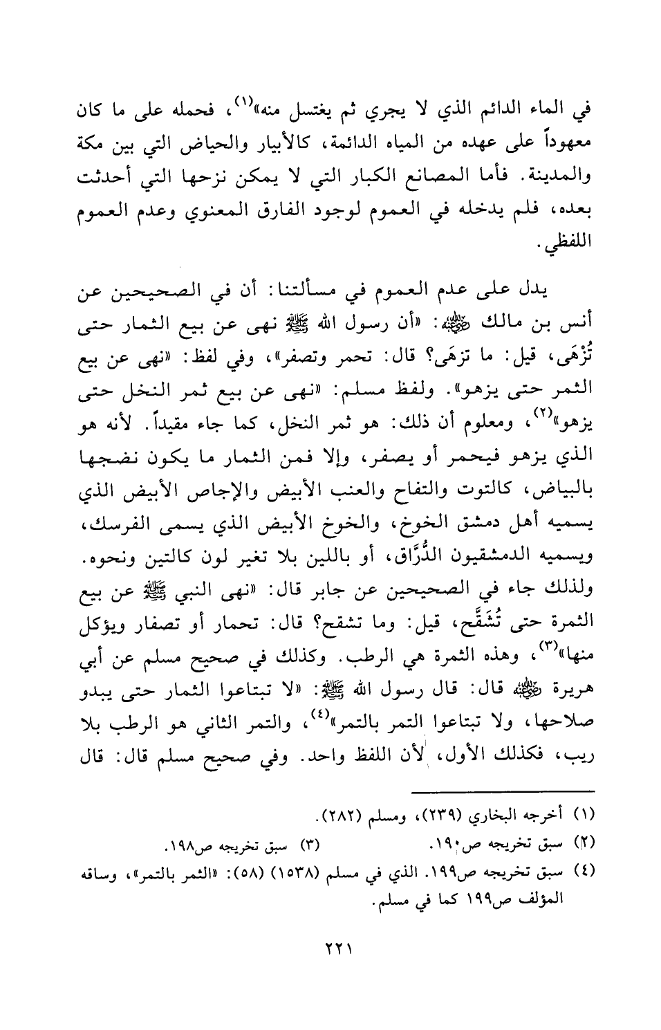 يَدُلُّ عَلَى عَدَمِ الْعُمُومِ فِي مَسْأَلَتِنَا: أَنَّ فِي الصَّحِيحَيْنِ عَنْ أَنَسِ بْنِ مَالِكٍ رَضِيَ اللَّهُ عَنْهُ: «أَنَّ رَسُولَ اللَّهِ - صَلَّى اللَّهُ عَلَيْهِ وَسَلَّمَ " نَهَى عَنْ بَيْعِ الثِّمَارِ حَتَّى تُزْهَى، قِيلَ: مَا تُزْهَى؟ قَالَ تَحْمَرُّ وَتَصْفَرُّ» وَفِي لَفْظٍ: «نَهَى عَنْ بَيْعِ الثَّمَرِ حَتَّى يَزْهُوَ» وَلَفْظُ مسلم: «نَهَى عَنْ بَيْعِ ثَمَرِ النَّخْلِ حَتَّى يَزْهُوَ» ، وَمَعْلُومٌ أَنَّ ذَلِكَ: هُوَ ثَمَرُ النَّخْلِ، كَمَا جَاءَ مُقَيَّدًا ; لِأَنَّهُ هُوَ الَّذِي يَزْهُو فَيَحْمَرُّ أَوْ يَصْفَرُّ، وَإِلَّا فَمِنَ الثِّمَارِ مَا يَكُونُ نُضْجُهَا بِالْبَيَاضِ، كَالتُّوتِ وَالتُّفَّاحِ وَالْعِنَبِ الْأَبْيَضِ وَالْإِجَّاصِ الْأَبْيَضِ الَّذِي يُسَمِّيهِ أَهْلُ دِمَشْقَ الْخَوْخَ، وَالْخَوْخُ الْأَبْيَضُ الَّذِي يُسَمَّى الْفِرْسِكَ، وَيُسَمِّيهِ الدِّمَشْقِيُّونَ الدُّرَّاقَ، أَوْ بِاللِّينِ بِلَا تَغَيُّرِ لَوْنٍ كَالتِّينِ وَنَحْوِهِ.