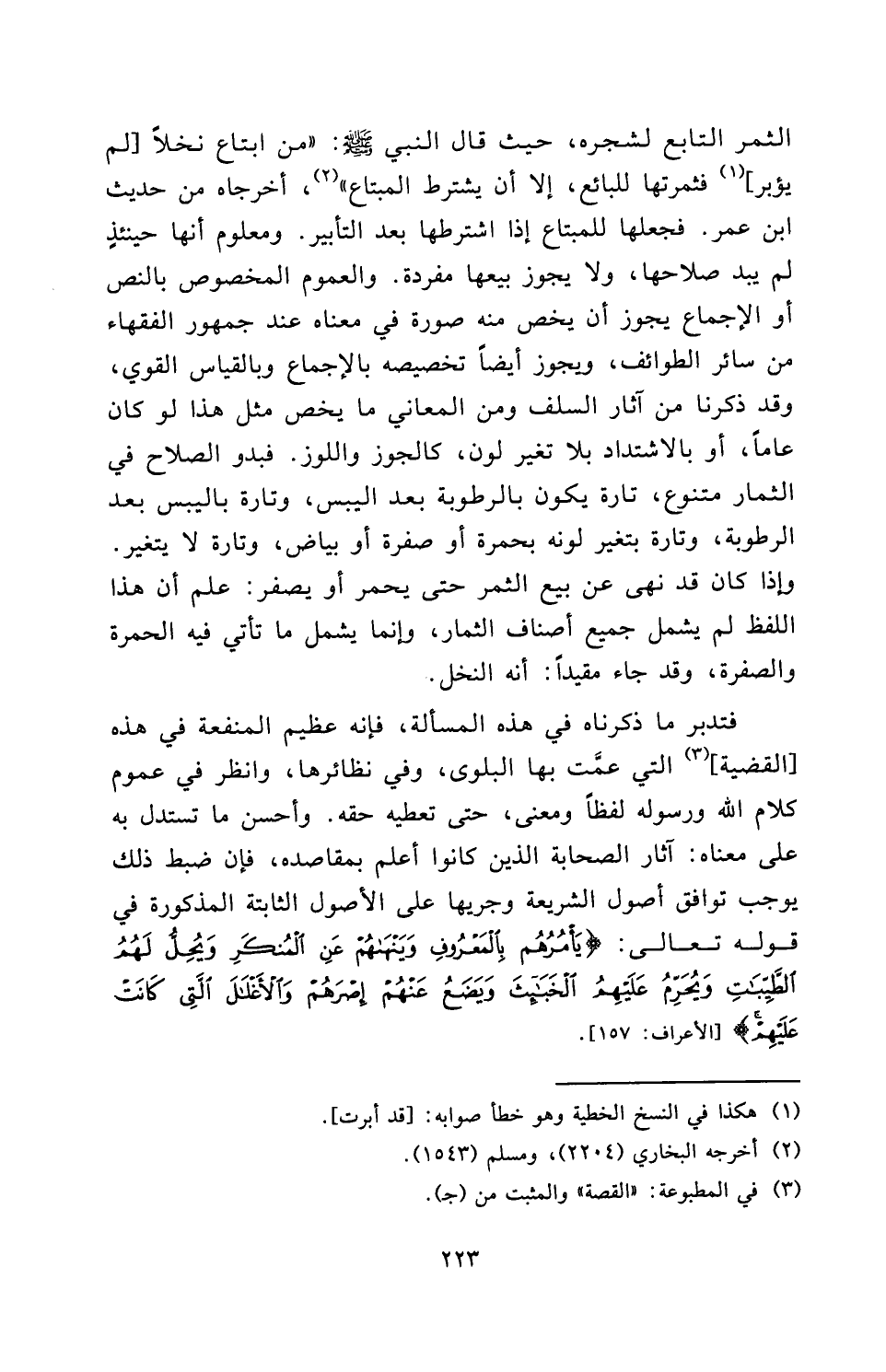 الثَّمَرِ التَّابِعِ لِشَجَرِهِ، حَيْثُ قَالَ النَّبِيُّ - صَلَّى اللَّهُ عَلَيْهِ وَسَلَّمَ -: «مَنِ ابْتَاعَ نَخْلًا [لَمْ يُؤَبَّرْ] فَثَمَرَتُهَا لِلْبَائِعِ، إِلَّا أَنْ يَشْتَرِطَ الْمُبْتَاعُ» أَخْرَجَاهُ مِنْ حَدِيثِ ابْنِ عُمَرَ. فَجَعَلَهَا لِلْمُبْتَاعِ إِذَا اشْتَرَطَهَا بَعْدَ التَّأْبِيرِ. وَمَعْلُومٌ أَنَّهَا حِينَئِذٍ لَمْ يَبْدُ صَلَاحُهَا، وَلَا يَجُوزُ بَيْعُهَا مُفْرَدَةً. وَالْعُمُومُ الْمَخْصُوصُ بِالنَّصِّ أَوِ الْإِجْمَاعِ يَجُوزُ أَنْ يُخَصَّ مِنْهُ صُورَةٌ فِي مَعْنَاهُ عِنْدَ جُمْهُورِ الْفُقَهَاءِ مِنْ سَائِرِ الطَّوَائِفِ، وَيَجُوزُ أَيْضًا تَخْصِيصُهُ بِالْإِجْمَاعِ وَبِالْقِيَاسِ الْقَوِيِّ، وَقَدْ ذَكَرْنَا مِنْ آثَارِ السَّلَفِ وَمِنَ الْمَعَانِي مَا يَخُصُّ مِثْلَ هَذَا لَوْ كَانَ عَامًّا، أَوْ بِالِاشْتِدَادِ بِلَا تَغَيُّرِ لَوْنٍ، كَالْجَوْزِ وَاللَّوْزِ، فَبُدُوُّ الصَّلَاحِ فِي الثِّمَارِ مُتَنَوِّعٌ، تَارَةً يَكُونُ بِالرُّطُوبَةِ بَعْدَ الْيُبْسِ، وَتَارَةً بِالْيُبْسِ بَعْدَ الرُّطُوبَةِ، وَتَارَةً بِتَغَيُّرِ لَوْنِهِ بِحُمْرَةٍ أَوْ صُفْرَةٍ أَوْ بَيَاضٍ، وَتَارَةً لَا يَتَغَيَّرُ.