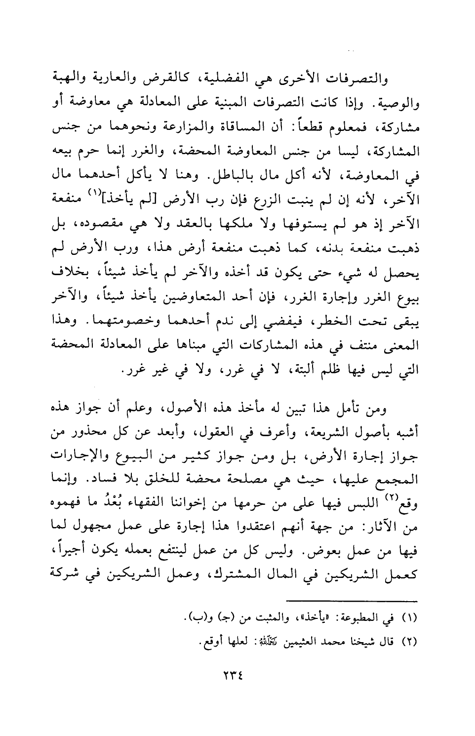 وَمَنْ تَأَمَّلَ هَذَا تَبَيَّنَ لَهُ مَأْخَذُ هَذِهِ الْأُصُولِ، وَعَلِمَ أَنَّ جَوَازَ هَذِهِ أَشْبَهُ بِأُصُولِ الشَّرِيعَةِ، وَأَعْرَفُ فِي الْعُقُولِ، وَأَبْعَدُ عَنْ كُلِّ مَحْذُورٍ مِنْ جَوَازِ إِجَارَةِ الْأَرْضِ، بَلْ وَمِنْ جَوَازِ كَثِيرٍ مِنَ الْبُيُوعِ وَالْإِجَارَاتِ الْمُجْمَعِ عَلَيْهَا، حَيْثُ هِيَ مَصْلَحَةٌ مَحْضَةٌ لِلْخَلْقِ بِلَا فَسَادٍ. وَإِنَّمَا وَقَعَ اللَّبْسُ فِيهَا عَلَى مَنْ حَرَّمَهَا مِنْ إِخْوَانِنَا الْفُقَهَاءِ بُعْدُ مَا فَهِمُوهُ مِنَ الْآثَارِ: مِنْ جِهَةِ أَنَّهُمُ اعْتَقَدُوا هَذَا إِجَارَةً عَلَى عَمَلٍ مَجْهُولٍ لِمَا فِيهَا مِنْ عَمَلٍ بِعِوَضٍ. وَلَيْسَ كُلُّ مَنْ عَمِلَ لِيَنْتَفِعَ بِعَمَلِهِ يَكُونُ أَجِيرًا، كَعَمَلِ الشَّرِيكَيْنِ فِي الْمَالِ الْمُشْتَرَكِ، وَعَمَلِ الشَّرِيكَيْنِ فِي شَرِكَةِ