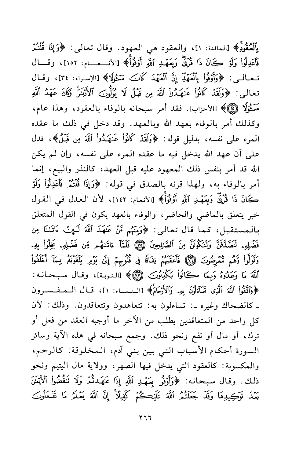 [الْمَائِدَةِ: 1] ، وَالْعُقُودُ هِيَ الْعُهُودُ. وَقَالَ تَعَالَى: {وَإِذَا قُلْتُمْ فَاعْدِلُوا وَلَوْ كَانَ ذَا قُرْبَى وَبِعَهْدِ اللَّهِ أَوْفُوا} [الأنعام: 152] [الْأَنْعَامِ: 152] ، وَقَالَ تَعَالَى: {وَأَوْفُوا بِالْعَهْدِ إِنَّ الْعَهْدَ كَانَ مَسْئُولًا} [الإسراء: 34] [الْإِسْرَاءِ: 34] ، وَقَالَ تَعَالَى: {وَلَقَدْ كَانُوا عَاهَدُوا اللَّهَ مِنْ قَبْلُ لَا يُوَلُّونَ الْأَدْبَارَ وَكَانَ عَهْدُ اللَّهِ مَسْئُولًا} [الأحزاب: 15] [الْأَحْزَابِ] . فَقَدْ أَمَرَ سُبْحَانَهُ بِالْوَفَاءِ بِالْعُقُودِ، وَهَذَا عَامٌّ، وَكَذَلِكَ أَمَرَ بِالْوَفَاءِ بِعَهْدِ اللَّهِ وَبِالْعَهْدِ. وَقَدْ دَخَلَ فِي ذَلِكَ مَا عَقَدَهُ الْمَرْءُ عَلَى نَفْسِهِ، بِدَلِيلِ قَوْلِهِ: {وَلَقَدْ كَانُوا عَاهَدُوا اللَّهَ مِنْ قَبْلُ} [الأحزاب: 15] ، فَدَلَّ عَلَى أَنَّ عَهْدَ اللَّهِ يَدْخُلُ فِيهِ مَا عَقَدَهُ الْمَرْءُ عَلَى نَفْسِهِ، وَإِنْ لَمْ يَكُنِ اللَّهُ قَدْ أَمَرَ بِنَفْسِ ذَلِكَ الْمَعْهُودِ عَلَيْهِ قَبْلَ الْعَهْدِ، كَالنَّذْرِ وَالْبَيْعِ، وَإِنَّمَا أَمَرَ بِالْوَفَاءِ بِهِ، وَلِهَذَا قَرَنَهُ بِالصِّدْقِ فِي قَوْلِهِ: {وَإِذَا قُلْتُمْ فَاعْدِلُوا وَلَوْ كَانَ ذَا قُرْبَى وَبِعَهْدِ اللَّهِ أَوْفُوا} [الأنعام: 152] [الْأَنْعَامِ: 142] ، لِأَنَّ الْعَدْلَ فِي الْقَوْلِ خَبَرٌ يَتَعَلَّقُ بِالْمَاضِي وَالْحَاضِرِ، وَالْوَفَاءُ بِالْعَهْدِ يَكُونُ فِي الْقَوْلِ الْمُتَعَلِّقِ بِالْمُسْتَقْبَلِ، كَمَا قَالَ تَعَالَى: {وَمِنْهُمْ مَنْ عَاهَدَ اللَّهَ لَئِنْ آتَانَا مِنْ فَضْلِهِ لَنَصَّدَّقَنَّ وَلَنَكُونَنَّ مِنَ الصَّالِحِينَ - فَلَمَّا آتَاهُمْ مِنْ فَضْلِهِ بَخِلُوا بِهِ وَتَوَلَّوْا وَهُمْ مُعْرِضُونَ - فَأَعْقَبَهُمْ نِفَاقًا فِي قُلُوبِهِمْ إِلَى يَوْمِ يَلْقَوْنَهُ بِمَا أَخْلَفُوا اللَّهَ مَا وَعَدُوهُ وَبِمَا كَانُوا يَكْذِبُونَ} [التوبة: 75 - 77] [التَّوْبَةِ] ، وَقَالَ سُبْحَانَهُ: {وَاتَّقُوا اللَّهَ الَّذِي تَسَاءَلُونَ بِهِ وَالْأَرْحَامَ} [النساء: 1] [النِّسَاءِ: 1] ، قَالَ الْمُفَسِّرُونَ - كالضحاك وَغَيْرِهِ -: تَسَاءَلُونَ بِهِ: تَتَعَاهَدُونَ وَتَتَعَاقَدُونَ. وَذَلِكَ لِأَنَّ كُلَّ وَاحِدٍ مِنَ الْمُتَعَاقِدَيْنِ يَطْلُبُ مِنَ الْآخَرِ مَا أَوْجَبَهُ الْعَقْدُ مِنْ فِعْلٍ أَوْ تَرْكٍ أَوْ مَالٍ أَوْ نَفْعٍ وَنَحْوِ ذَلِكَ. وَجَمَعَ سُبْحَانَهُ فِي هَذِهِ الْآيَةِ وَسَائِرِ السُّورَةِ أَحْكَامَ الْأَسْبَابِ الَّتِي بَيْنَ بَنِي آدَمَ، الْمَخْلُوقَةِ: كَالرَّحِمِ، وَالْمَكْسُوبَةِ: كَالْعُقُودِ الَّتِي يَدْخُلُ فِيهَا الصِّهْرُ وَوِلَايَةُ مَالِ الْيَتِيمِ وَنَحْوُ ذَلِكَ. وَقَالَ سُبْحَانَهُ: {وَأَوْفُوا بِعَهْدِ اللَّهِ إِذَا عَاهَدْتُمْ وَلَا تَنْقُضُوا الْأَيْمَانَ بَعْدَ تَوْكِيدِهَا وَقَدْ جَعَلْتُمُ اللَّهَ عَلَيْكُمْ كَفِيلًا إِنَّ اللَّهَ يَعْلَمُ مَا تَفْعَلُونَ} [النحل: 91]