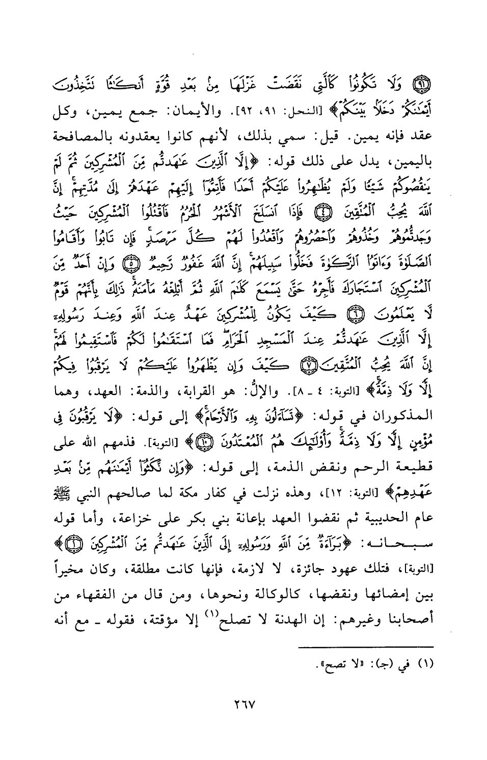 {وَلَا تَكُونُوا كَالَّتِي نَقَضَتْ غَزْلَهَا مِنْ بَعْدِ قُوَّةٍ أَنْكَاثًا تَتَّخِذُونَ أَيْمَانَكُمْ دَخَلًا بَيْنَكُمْ} [النحل: 92] [النَّحْلِ: 91، 92] . وَالْأَيْمَانُ: جَمْعُ يَمِينٍ، وَكُلُّ عَقْدٍ فَإِنَّهُ يَمِينٌ. قِيلَ: سُمِّيَ بِذَلِكَ؛ لِأَنَّهُمْ كَانُوا يَعْقِدُونَهُ بِالْمُصَافَحَةِ بِالْيَمِينِ، يَدُلُّ عَلَى ذَلِكَ قَوْلُهُ: {إِلَّا الَّذِينَ عَاهَدْتُمْ مِنَ الْمُشْرِكِينَ ثُمَّ لَمْ يَنْقُصُوكُمْ شَيْئًا وَلَمْ يُظَاهِرُوا عَلَيْكُمْ أَحَدًا فَأَتِمُّوا إِلَيْهِمْ عَهْدَهُمْ إِلَى مُدَّتِهِمْ إِنَّ اللَّهَ يُحِبُّ الْمُتَّقِينَ - فَإِذَا انْسَلَخَ الْأَشْهُرُ الْحُرُمُ فَاقْتُلُوا الْمُشْرِكِينَ حَيْثُ وَجَدْتُمُوهُمْ وَخُذُوهُمْ وَاحْصُرُوهُمْ وَاقْعُدُوا لَهُمْ كُلَّ مَرْصَدٍ فَإِنْ تَابُوا وَأَقَامُوا الصَّلَاةَ وَآتَوُا الزَّكَاةَ فَخَلُّوا سَبِيلَهُمْ إِنَّ اللَّهَ غَفُورٌ رَحِيمٌ - وَإِنْ أَحَدٌ مِنَ الْمُشْرِكِينَ اسْتَجَارَكَ فَأَجِرْهُ حَتَّى يَسْمَعَ كَلَامَ اللَّهِ ثُمَّ أَبْلِغْهُ مَأْمَنَهُ ذَلِكَ بِأَنَّهُمْ قَوْمٌ لَا يَعْلَمُونَ - كَيْفَ يَكُونُ لِلْمُشْرِكِينَ عَهْدٌ عِنْدَ اللَّهِ وَعِنْدَ رَسُولِهِ إِلَّا الَّذِينَ عَاهَدْتُمْ عِنْدَ الْمَسْجِدِ الْحَرَامِ فَمَا اسْتَقَامُوا لَكُمْ فَاسْتَقِيمُوا لَهُمْ إِنَّ اللَّهَ يُحِبُّ الْمُتَّقِينَ - كَيْفَ وَإِنْ يَظْهَرُوا عَلَيْكُمْ لَا يَرْقُبُوا فِيكُمْ إِلًّا وَلَا ذِمَّةً} [التوبة: 4 - 8] [التَّوْبَةِ: 4 - 8] . وَالْإِلُّ: هُوَ الْقَرَابَةُ، وَالذِّمَّةُ: الْعَهْدُ، وَهُمَا الْمَذْكُورَانِ فِي قَوْلِهِ: {تَسَاءَلُونَ بِهِ وَالْأَرْحَامَ} [النساء: 1] إِلَى قَوْلِهِ: {لَا يَرْقُبُونَ فِي مُؤْمِنٍ إِلًّا وَلَا ذِمَّةً وَأُولَئِكَ هُمُ الْمُعْتَدُونَ} [التوبة: 10] [التَّوْبَةِ] . فَذَمَّهُمُ اللَّهُ عَلَى قَطِيعَةِ الرَّحِمِ وَنَقْضِ الذِّمَّةِ، إِلَى قَوْلِهِ: {وَإِنْ نَكَثُوا أَيْمَانَهُمْ مِنْ بَعْدِ عَهْدِهِمْ} [التوبة: 12] [التَّوْبَةِ: 12] ، وَهَذِهِ نَزَلَتْ فِي كُفَّارِ مَكَّةَ لَمَّا صَالَحَهُمُ النَّبِيُّ صَلَّى اللَّهُ عَلَيْهِ وَسَلَّمَ عَامَ الْحُدَيْبِيَةِ ثُمَّ نَقَضُوا الْعَهْدَ بِإِعَانَةِ بَنِي بَكْرٍ عَلَى خُزَاعَةَ، وَأَمَّا قَوْلُهُ سُبْحَانَهُ: {بَرَاءَةٌ مِنَ اللَّهِ وَرَسُولِهِ إِلَى الَّذِينَ عَاهَدْتُمْ مِنَ الْمُشْرِكِينَ} [التوبة: 1] [التَّوْبَةِ] فَتِلْكَ عُهُودٌ جَائِزَةٌ، لَا لَازِمَةٌ، فَإِنَّهَا كَانَتْ مُطْلَقَةً، وَكَانَ مُخَيَّرًا بَيْنَ إِمْضَائِهَا وَنَقْضِهَا كَالْوَكَالَةِ وَنَحْوِهَا، وَمَنْ قَالَ مِنَ الْفُقَهَاءِ مِنْ أَصْحَابِنَا وَغَيْرِهِمْ: إِنَّ الْهُدْنَةَ لَا تَصْلُحُ إِلَّا مُؤَقَّتَةً، فَقَوْلُهُ مَعَ أَنَّهُ