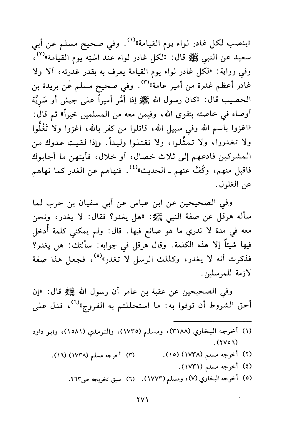 «يُنْصَبُ لِكُلِّ غَادِرٍ لِوَاءٌ يَوْمَ الْقِيَامَةِ» . وَفِي صَحِيحِ مسلم عَنْ أبي سعيد عَنِ النَّبِيِّ صَلَّى اللَّهُ عَلَيْهِ وَسَلَّمَ قَالَ: " «لِكُلِّ غَادِرٍ لِوَاءٌ عِنْدَ اسْتِهِ يَوْمَ الْقِيَامَةِ» ". وَفِي رِوَايَةٍ: «لِكُلِّ غَادِرٍ لِوَاءٌ يَوْمَ الْقِيَامَةِ يُعْرَفُ بِهِ بِقَدْرِ غَدْرَتِهِ، أَلَا وَلَا غَادِرَ أَعْظَمُ غَدْرَةً مِنْ أَمِيرِ عَامَّةٍ» . وَفِي صَحِيحِ مسلم عَنْ بُرَيْدَةَ بْنِ الْحُصَيْبِ قَالَ: " «كَانَ رَسُولُ اللَّهِ صَلَّى اللَّهُ عَلَيْهِ وَسَلَّمَ إِذَا أَمَّرَ أَمِيرًا عَلَى جَيْشٍ أَوْ سَرِيَّةٍ أَوْصَاهُ فِي خَاصَّتِهِ بِتَقْوَى اللَّهِ، وَفِيمَنْ مَعَهُ مِنَ الْمُسْلِمِينَ خَيْرًا " ثُمَّ قَالَ: اغْزُوَا بِاسْمِ اللَّهِ وَفِي سَبِيلِ اللَّهِ، قَاتِلُوا مَنْ كَفَرَ بِاللَّهِ، اغْزُوا وَلَا تَغُلُّوا وَلَا تَغْدِرُوا، وَلَا تُمَثِّلُوا، وَلَا تَقْتُلُوا وَلِيدًا. وَإِذَا لَقِيتَ عَدُوَّكَ مِنَ الْمُشْرِكِينَ فَادْعُهُمْ إِلَى ثَلَاثِ خِصَالٍ - أَوْ: خِلَالٍ - فَأَيَّتُهُنَّ مَا أَجَابُوكَ فَاقْبَلْ مِنْهُمْ وَكُفَّ عَنْهُمْ» " الْحَدِيثَ. فَنَهَاهُمْ عَنِ الْغَدْرِ كَمَا نَهَاهُمْ عَنِ الْغُلُولِ.