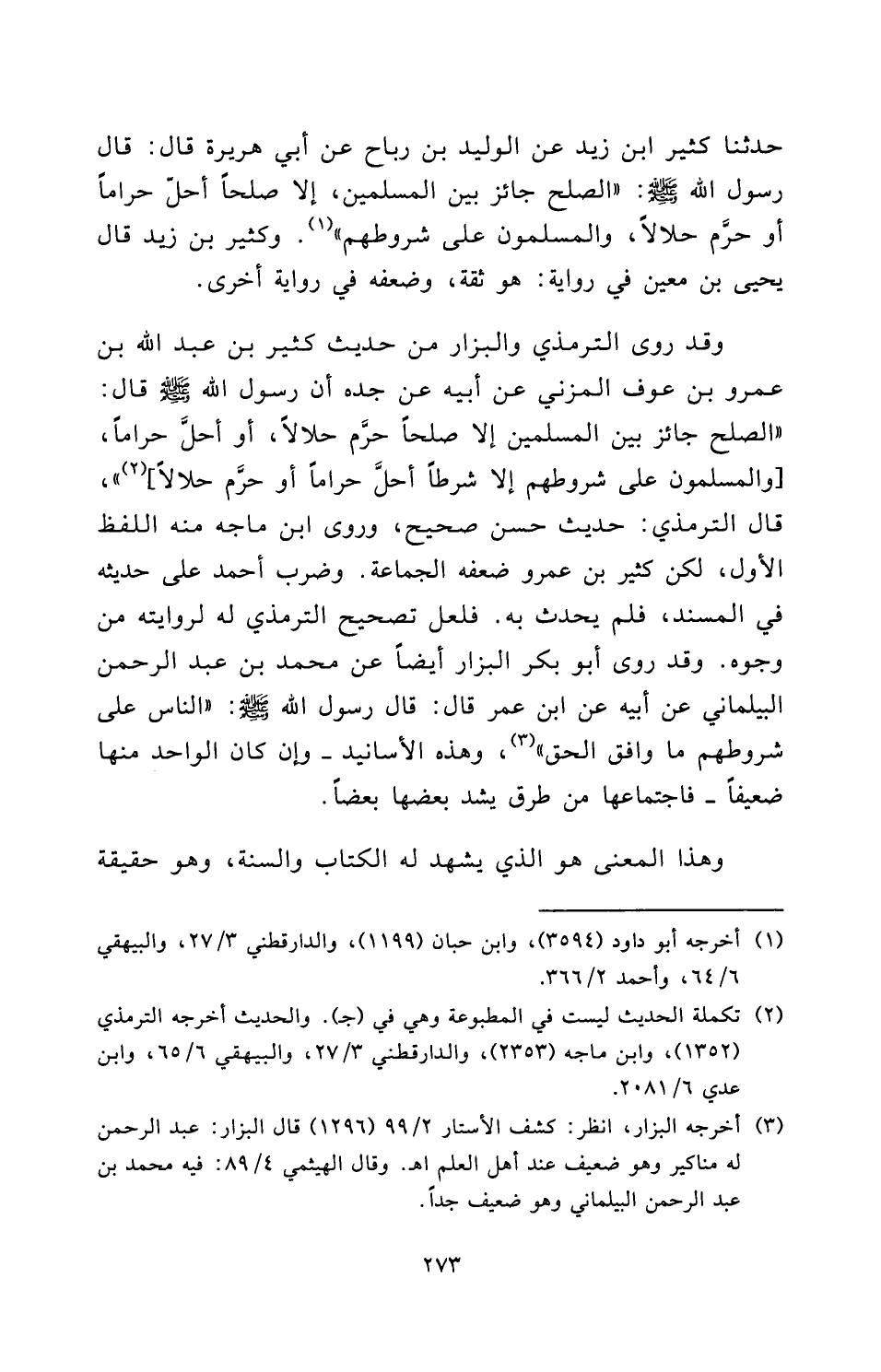 وَقَدْ رَوَى التِّرْمِذِيُّ وَالْبَزَّارُ مِنْ حَدِيثِ كثير بن عبد الله بن عمرو بن عوف المزني عَنْ أَبِيهِ عَنْ جَدِّهِ أَنَّ رَسُولَ اللَّهِ صَلَّى اللَّهُ عَلَيْهِ وَسَلَّمَ قَالَ: «الصُّلْحُ جَائِزٌ بَيْنَ الْمُسْلِمِينَ، إِلَّا صُلْحًا حَرَّمَ حَلَالًا أَوْ أَحَلَّ حَرَامًا، [وَالْمُسْلِمُونَ عَلَى شُرُوطِهِمْ إِلَّا شَرْطًا أَحَلَّ حَرَامًا أَوْ حَرَّمَ حَلَالًا] » ، قَالَ التِّرْمِذِيُّ: حَدِيثٌ حَسَنٌ صَحِيحٌ، وَرَوَى ابْنُ مَاجَهْ مِنْهُ اللَّفْظَ الْأَوَّلَ، لَكِنَّ كثير بن عمرو ضَعَّفَهُ الْجَمَاعَةُ. وَضَرَبَ أحمد عَلَى حَدِيثِهِ فِي الْمُسْنَدِ فَلَمْ يُحَدِّثْ بِهِ. فَلَعَلَّ تَصْحِيحَ الترمذي لَهُ لِرِوَايَتِهِ مِنْ وُجُوهٍ. وَقَدْ رَوَى أَبُو بَكْرٍ الْبَزَّارُ أَيْضًا عَنْ محمد بن عبد الرحمن البيلماني عَنْ أَبِيهِ عَنِ ابْنِ عُمَرَ قَالَ: قَالَ رَسُولُ اللَّهِ صَلَّى اللَّهُ عَلَيْهِ وَسَلَّمَ: " «النَّاسُ عَلَى شُرُوطِهِمْ مَا وَافَقَ الْحَقَّ» "، وَهَذِهِ الْأَسَانِيدُ - وَإِنْ كَانَ الْوَاحِدُ مِنْهَا ضَعِيفًا - فَاجْتِمَاعُهَا مِنْ طُرُقٍ يَشُدُّ بَعْضُهَا بَعْضًا.
