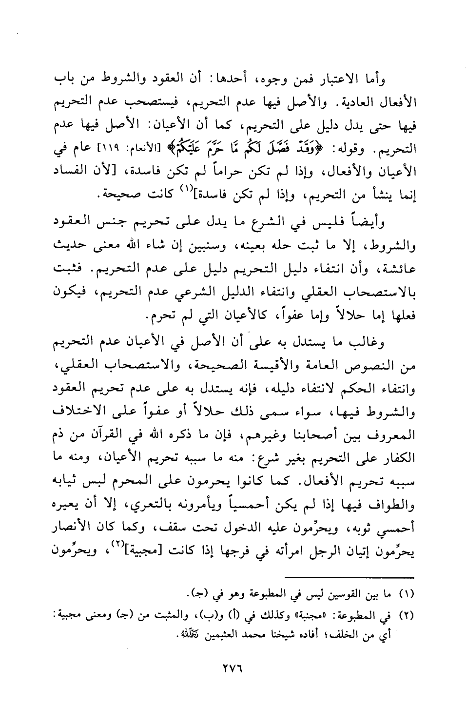 وَغَالِبُ مَا يُسْتَدَلُّ بِهِ عَلَى أَنَّ الْأَصْلَ فِي الْأَعْيَانِ عَدَمُ التَّحْرِيمِ مِنَ النُّصُوصِ الْعَامَّةِ وَالْأَقْيِسَةِ الصَّحِيحَةِ وَالِاسْتِصْحَابِ الْعَقْلِيِّ وَانْتِفَاءِ الْحُكْمِ لِانْتِفَاءِ دَلِيلِهِ، فَإِنَّهُ يُسْتَدَلُّ بِهِ عَلَى عَدَمِ تَحْرِيمِ الْعُقُودِ وَالشُّرُوطِ فِيهَا، سَوَاءٌ سُمِّيَ ذَلِكَ حَلَالًا أَوْ عَفْوًا عَلَى الِاخْتِلَافِ الْمَعْرُوفِ بَيْنَ أَصْحَابِنَا وَغَيْرِهِمْ، فَإِنَّ مَا ذَكَرَهُ اللَّهُ فِي الْقُرْآنِ مِنْ ذَمِّ الْكُفَّارِ عَلَى التَّحْرِيمِ بِغَيْرِ شَرْعٍ: مِنْهُ مَا سَبَبُهُ تَحْرِيمُ الْأَعْيَانِ، وَمِنْهُ مَا سَبَبُهُ تَحْرِيمُ الْأَفْعَالِ. كَمَا كَانُوا يُحَرِّمُونَ عَلَى الْمُحْرِمِ لُبْسَ ثِيَابِهِ وَالطَّوَافَ فِيهَا إِذَا لَمْ يَكُنْ أَحْمَسِيًّا وَيَأْمُرُونَهُ بِالتَّعَرِّي، إِلَّا أَنْ يُعِيرَهُ أَحْمَسِيٌّ ثَوْبَهُ، وَيُحَرِّمُونَ عَلَيْهِ الدُّخُولَ تَحْتَ سَقْفٍ، كَمَا كَانَ الْأَنْصَارُ يُحَرِّمُونَ إِتْيَانَ الرَّجُلِ امْرَأَتَهُ فِي فَرْجِهَا إِذَا كَانَتْ [مُجَبِّيَةً] ، وَيُحَرِّمُونَ
