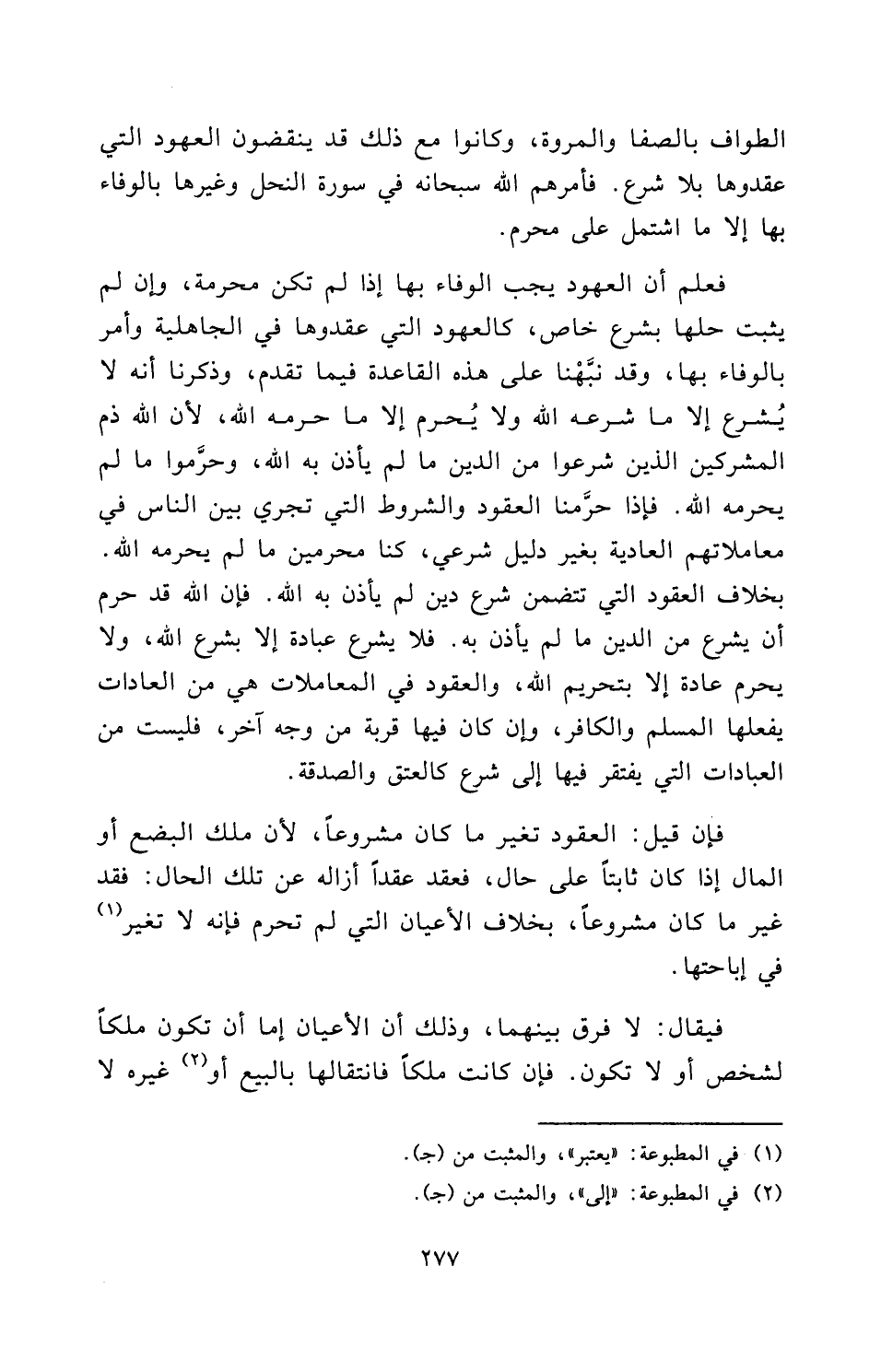 فَعُلِمَ أَنَّ الْعُهُودَ يَجِبُ الْوَفَاءُ بِهَا إِذَا لَمْ تَكُنْ مُحَرَّمَةً، وَإِنْ لَمْ يَثْبُتْ حِلُّهَا بِشَرْعٍ خَاصٍّ، كَالْعُهُودِ الَّتِي عَقَدُوهَا فِي الْجَاهِلِيَّةِ وَأُمِرَ بِالْوَفَاءِ بِهَا، وَقَدْ نَبَّهْنَا عَلَى هَذِهِ الْقَاعِدَةِ فِيمَا تَقَدَّمَ، وَذَكَرْنَا أَنَّهُ لَا يُشْرَعُ إِلَّا مَا شَرَعَهُ اللَّهُ وَلَا يَحْرُمُ إِلَّا مَا حَرَّمَهُ اللَّهُ؛ لِأَنَّ اللَّهَ ذَمَّ الْمُشْرِكِينَ الَّذِينَ شَرَعُوا مِنَ الدِّينِ مَا لَمْ يَأْذَنْ بِهِ اللَّهُ، وَحَرَّمُوا مَا لَمْ يُحَرِّمْهُ اللَّهُ. فَإِذَا حَرَّمْنَا الْعُقُودَ وَالشُّرُوطَ الَّتِي تَجْرِي بَيْنَ النَّاسِ فِي مُعَامَلَاتِهِمُ الْعَادِيَّةِ بِغَيْرِ دَلِيلٍ شَرْعِيٍّ، كُنَّا مُحَرِّمِينَ مَا لَمْ يُحَرِّمْهُ اللَّهُ. بِخِلَافِ الْعُقُودِ الَّتِي تَتَضَمَّنُ شَرْعَ دِينٍ لَمْ يَأْذَنْ بِهِ اللَّهُ. فَإِنَّ اللَّهَ قَدْ حَرَّمَ أَنْ يُشْرَعَ مِنَ الدِّينِ مَا لَمْ يَأْذَنْ بِهِ. فَلَا يُشَرِّعُ عِبَادَةً إِلَّا بِشَرْعِ اللَّهِ، وَلَا يُحَرِّمُ عَادَةً إِلَّا بِتَحْرِيمِ اللَّهِ، وَالْعُقُودُ فِي الْمُعَامَلَاتِ هِيَ مِنَ الْعَادَاتِ يَفْعَلُهَا الْمُسْلِمُ وَالْكَافِرُ، وَإِنْ كَانَ فِيهَا قُرْبَةٌ مِنْ وَجْهٍ آخَرَ، فَلَيْسَتْ مِنَ الْعِبَادَاتِ الَّتِي يُفْتَقَرُ فِيهَا إِلَى شَرْعٍ كَالْعِتْقِ وَالصَّدَقَةِ.