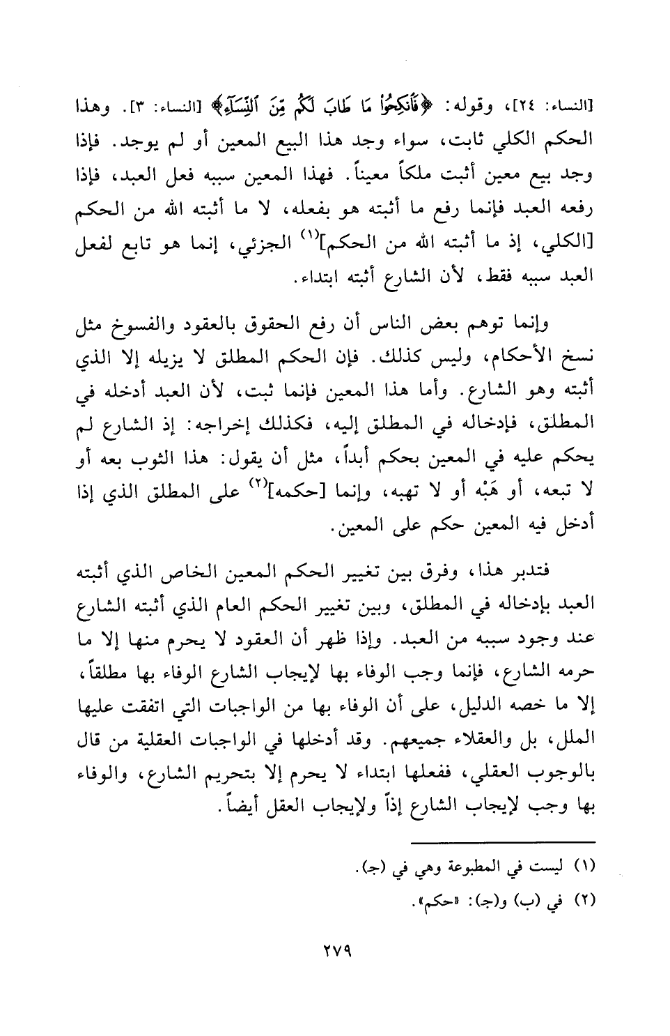 [النِّسَاءِ: 24] ، وَقَوْلِهِ: {فَانْكِحُوا مَا طَابَ لَكُمْ مِنَ النِّسَاءِ} [النساء: 3] [النِّسَاءِ: 3] . وَهَذَا الْحُكْمُ الْكُلِّيُّ ثَابِتٌ، سَوَاءٌ وُجِدَ هَذَا الْبَيْعُ الْمُعَيَّنُ أَوْ لَمْ يُوجَدْ. فَإِذَا وُجِدَ بَيْعٌ مُعَيَّنٌ أَثْبَتَ مِلْكَهَا مُعَيَّنًا، فَهَذَا الْمُعَيَّنُ سَبَبُهُ فِعْلُ الْعَبْدُ، فَإِذَا رَفَعَهُ الْعَبْدُ فَإِنَّمَا رَفَعَ مَا أَثْبَتَهُ هُوَ بِفِعْلِهِ، لَا مَا أَثْبَتَهُ اللَّهُ مِنَ الْحُكْمِ [الْكُلِّيِّ، إِذْ مَا أَثْبَتَهُ اللَّهُ مِنَ الْحُكْمِ] الْجُزْئِيِّ إِنَّمَا هُوَ تَابِعٌ لِفِعْلِ الْعَبْدِ سَبَبُهُ فَقَطْ لِأَنَّ، الشَّارِعَ أَثْبَتَهُ ابْتِدَاءً.