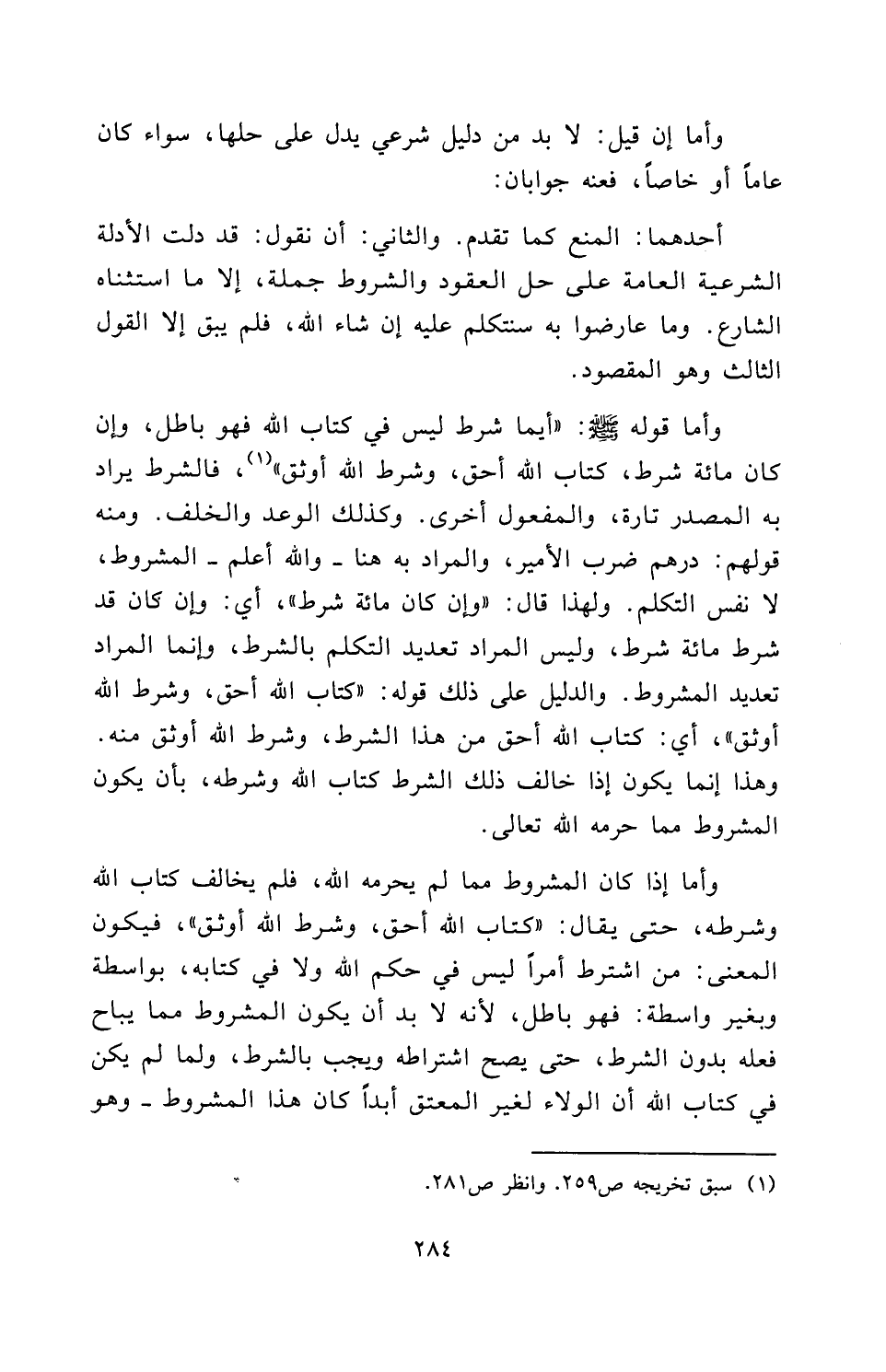 وَأَمَّا إِذَا كَانَ الْمَشْرُوطُ مِمَّا لَمْ يُحَرِّمْهُ اللَّهُ، فَلَمْ يُخَالِفْ كِتَابَ اللَّهِ وَشَرْطَهُ، حَتَّى يُقَالَ: " «كِتَابُ اللَّهِ أَحَقُّ، وَشَرْطُ اللَّهِ أَوْثَقُ» " فَيَكُونُ الْمَعْنَى: مَنِ اشْتَرَطَ أَمْرًا لَيْسَ فِي حُكْمِ اللَّهِ وَلَا فِي كِتَابِهِ، بِوَاسِطَةٍ وَبِغَيْرِ وَاسِطَةٍ فَهُوَ بَاطِلٌ؛ لِأَنَّهُ لَا بُدَّ أَنْ يَكُونَ الْمَشْرُوطُ مِمَّا يُبَاحُ فِعْلُهُ بِدُونِ الشَّرْطِ، حَتَّى يَصِحَّ اشْتِرَاطُهُ وَيَجِبَ بِالشَّرْطِ، وَلَمَّا لَمْ يَكُنْ فِي كِتَابِ اللَّهِ أَنَّ الْوَلَاءَ لِغَيْرِ الْمُعْتِقِ أَبَدًا كَانَ هَذَا الْمَشْرُوطُ - وَهُوَ