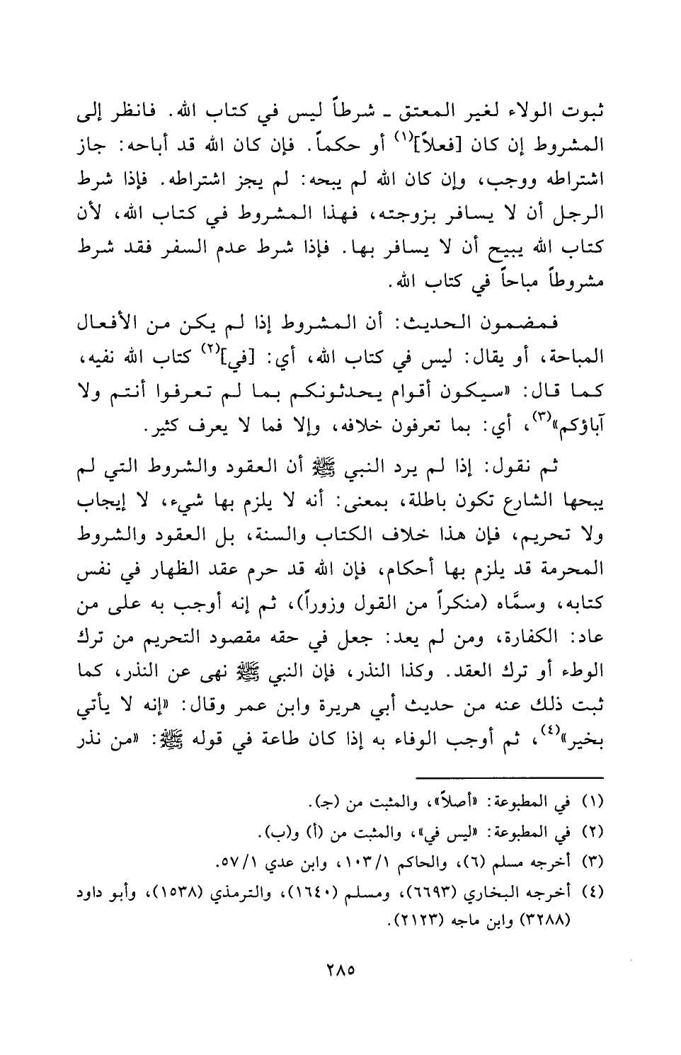 ثُبُوتُ الْوَلَاءِ لِغَيْرِ الْمُعْتِقِ - شَرْطًا لَيْسَ فِي كِتَابِ اللَّهِ. فَانْظُرْ إِلَى الْمَشْرُوطِ إِنْ كَانَ [فِعْلًا] أَوْ حُكْمًا. فَإِنْ كَانَ اللَّهُ قَدْ أَبَاحَهُ: جَازَ اشْتِرَاطُهُ وَوَجَبَ، وَإِنْ كَانَ اللَّهُ لَمْ يُبِحْهُ: لَمْ يَجُزِ اشْتِرَاطُهُ. فَإِذَا شَرَطَ الرَّجُلُ أَنْ لَا يُسَافِرَ بِزَوْجَتِهِ، فَهَذَا الْمَشْرُوطُ فِي كِتَابِ اللَّهِ؛ لِأَنَّ كِتَابَ اللَّهِ يُبِيحُ أَنْ لَا يُسَافِرَ بِهَا. فَإِذَا شَرَطَ عَدَمَ السَّفَرِ فَقَدْ شَرَطَ مَشْرُوطًا مُبَاحًا فِي كِتَابِ اللَّهِ.