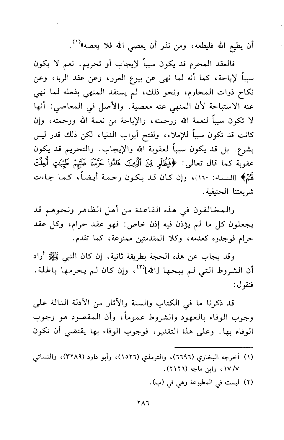 فَالْعَقْدُ الْمُحَرَّمُ قَدْ يَكُونُ سَبَبًا لِإِيجَابٍ أَوْ تَحْرِيمٍ. نَعَمْ لَا يَكُونُ سَبَبًا لِإِبَاحَةٍ، كَمَا أَنَّهُ لَمَّا نُهِيَ عَنْ بُيُوعِ الْغَرَرِ، وَعَنْ عَقْدِ الرِّبَا، وَعَنْ نِكَاحِ ذَوَاتِ الْمَحَارِمِ، وَنَحْوِ ذَلِكَ، لَمْ يَسْتَفِدِ الْمَنْهِيُّ بِفِعْلِهِ لِمَا نُهِيَ عَنْهُ الِاسْتِبَاحَةَ؛ لِأَنَّ الْمَنْهِيَّ عَنْهُ مَعْصِيَةٌ. وَالْأَصْلُ فِي الْمَعَاصِي أَنَّهَا لَا تَكُونُ سَبَبًا لِنِعْمَةِ اللَّهِ وَرَحْمَتِهِ، وَالْإِبَاحَةُ مِنْ نِعْمَةِ اللَّهِ وَرَحْمَتِهِ، وَإِنْ كَانَتْ قَدْ تَكُونُ سَبَبًا لِلْإِمْلَاءِ، وَلِفَتْحِ أَبْوَابِ الدُّنْيَا، لَكِنَّ ذَلِكَ قَدَرٌ لَيْسَ بِشَرْعٍ. بَلْ قَدْ يَكُونُ سَبَبًا لِعُقُوبَةِ اللَّهِ وَالْإِيجَابِ، وَالتَّحْرِيمُ قَدْ يَكُونُ عُقُوبَةً كَمَا قَالَ اللَّهُ تَعَالَى: {فَبِظُلْمٍ مِنَ الَّذِينَ هَادُوا حَرَّمْنَا عَلَيْهِمْ طَيِّبَاتٍ أُحِلَّتْ لَهُمْ} [النساء: 160] [النِّسَاءِ: 160] ، وَإِنْ كَانَ قَدْ يَكُونُ رَحْمَةً أَيْضًا، كَمَا جَاءَتْ شَرِيعَتُنَا الْحَنِيفِيَّةُ.