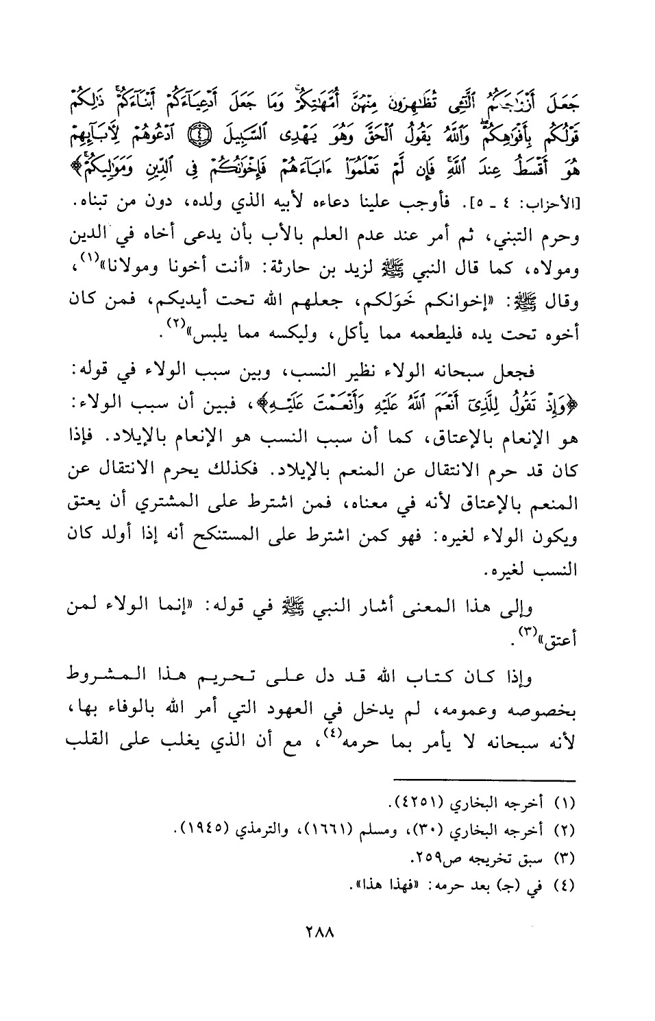 {مَا جَعَلَ اللَّهُ لِرَجُلٍ مِنْ قَلْبَيْنِ فِي جَوْفِهِ وَمَا جَعَلَ أَزْوَاجَكُمُ اللَّائِي تُظَاهِرُونَ مِنْهُنَّ أُمَّهَاتِكُمْ وَمَا جَعَلَ أَدْعِيَاءَكُمْ أَبْنَاءَكُمْ ذَلِكُمْ قَوْلُكُمْ بِأَفْوَاهِكُمْ وَاللَّهُ يَقُولُ الْحَقَّ وَهُوَ يَهْدِي السَّبِيلَ - ادْعُوهُمْ لِآبَائِهِمْ هُوَ أَقْسَطُ عِنْدَ اللَّهِ فَإِنْ لَمْ تَعْلَمُوا آبَاءَهُمْ فَإِخْوَانُكُمْ فِي الدِّينِ وَمَوَالِيكُمْ} [الأحزاب: 4 - 5] [الْأَحْزَابِ: 4 - 5] ، فَأَوْجَبَ عَلَيْنَا دُعَاءَهُ لِأَبِيهِ الَّذِي وَلَدَهُ، دُونَ مَنْ تَبَنَّاهُ. وَحَرَّمَ التَّبَنِّي، ثُمَّ أَمَرَ عِنْدَ عَدَمِ الْعِلْمِ بِالْأَبِ بِأَنْ يُدْعَى أَخَاهُ فِي الدِّينِ وَمَوْلَاهُ، كَمَا قَالَ النَّبِيُّ صَلَّى اللَّهُ عَلَيْهِ وَسَلَّمَ لِزَيْدِ بْنِ حَارِثَةَ: «أَنْتَ أَخُونَا وَمَوْلَانَا» ، وَقَالَ صَلَّى اللَّهُ عَلَيْهِ وَسَلَّمَ: «إِخْوَانُكُمْ خَوَلُكُمْ، جَعَلَهُمُ اللَّهُ تَحْتَ أَيْدِيكُمْ، فَمَنْ كَانَ أَخُوهُ تَحْتَ يَدِهِ فَلْيُطْعِمْهُ مِمَّا يَأْكُلُ، وَلْيَكْسُهُ مِمَّا يَلْبَسُ» .