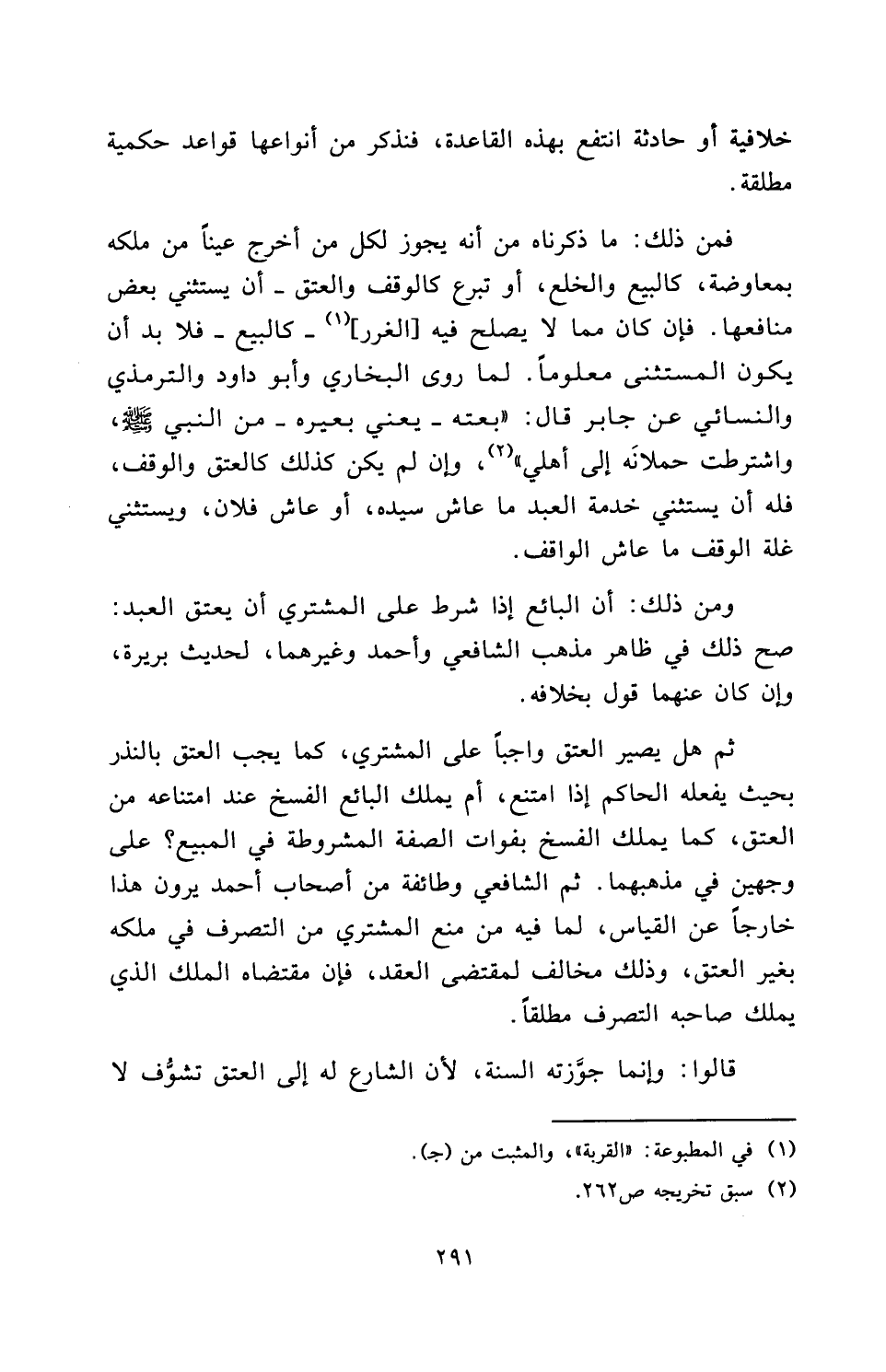 ثُمَّ هَلْ يَصِيرُ الْعِتْقُ وَاجِبًا عَلَى الْمُشْتَرِي، كَمَا يَجِبُ الْعِتْقُ بِالنَّذْرِ بِحَيْثُ يَفْعَلُهُ الْحَاكِمُ إِذَا امْتَنَعَ، أَمْ يَمْلِكُ الْبَائِعُ الْفَسْخَ عِنْدَ امْتِنَاعِهِ مِنَ الْعِتْقِ، كَمَا يَمْلِكُ الْفَسْخَ بِفَوَاتِ الصِّفَةِ الْمَشْرُوطَةِ فِي الْمَبِيعِ؟ عَلَى وَجْهَيْنِ فِي مَذْهَبِهِمَا. ثُمَّ الشَّافِعِيُّ وَطَائِفَةٌ مِنْ أَصْحَابِ أحمد يَرَوْنَ هَذَا خَارِجًا عَنِ الْقِيَاسِ، لِمَا فِيهِ مِنْ مَنْعِ الْمُشْتَرِي مِنَ التَّصَرُّفِ فِي مِلْكِهِ بِغَيْرِ الْعِتْقِ، وَذَلِكَ مُخَالِفٌ لِمُقْتَضَى الْعَقْدِ، فَإِنَّ مُقْتَضَاهُ الْمِلْكُ الَّذِي يَمْلِكُ صَاحِبُهُ التَّصَرُّفَ مُطْلَقًا.