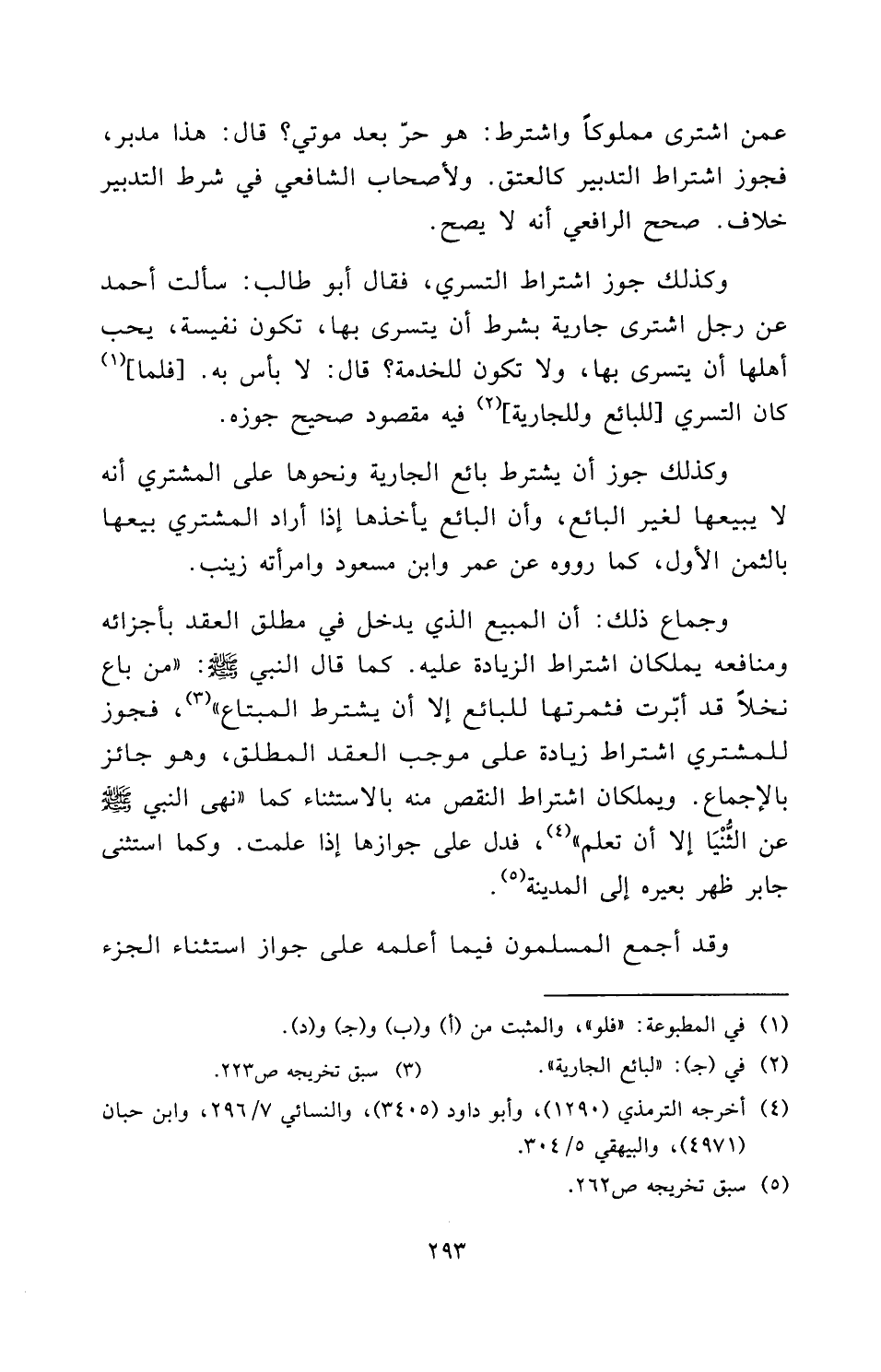 وَجِمَاعُ ذَلِكَ: أَنَّ الْمَبِيعَ الَّذِي يَدْخُلُ فِي مُطْلَقِ الْعَقْدِ بِأَجْزَائِهِ وَمَنَافِعِهِ يَمْلِكَانِ اشْتِرَاطَ الزِّيَادَةِ عَلَيْهِ. كَمَا قَالَ النَّبِيُّ صَلَّى اللَّهُ عَلَيْهِ وَسَلَّمَ: «مَنْ بَاعَ نَخْلًا قَدْ أُبِّرَتْ فَثَمَرَتُهَا لِلْبَائِعِ إِلَّا أَنْ يَشْتَرِطَ الْمُبْتَاعُ» ، فَجَوَّزَ لِلْمُشْتَرِي اشْتِرَاطَ زِيَادَةٍ عَلَى مُوجَبِ الْعَقْدِ الْمُطْلَقِ، وَهُوَ جَائِزٌ بِالْإِجْمَاعِ. وَيَمْلِكَانِ اشْتِرَاطَ النَّقْصِ مِنْهُ بِالِاسْتِثْنَاءِ كَمَا " «نَهَى النَّبِيُّ صَلَّى اللَّهُ عَلَيْهِ وَسَلَّمَ عَنِ الثُّنْيَا إِلَّا أَنْ تُعْلَمَ» "، فَدَلَّ عَلَى جَوَازِهَا إِذَا عُلِمَتْ. وَكَمَا اسْتَثْنَى جابر ظَهْرَ بَعِيرِهِ إِلَى الْمَدِينَةِ.