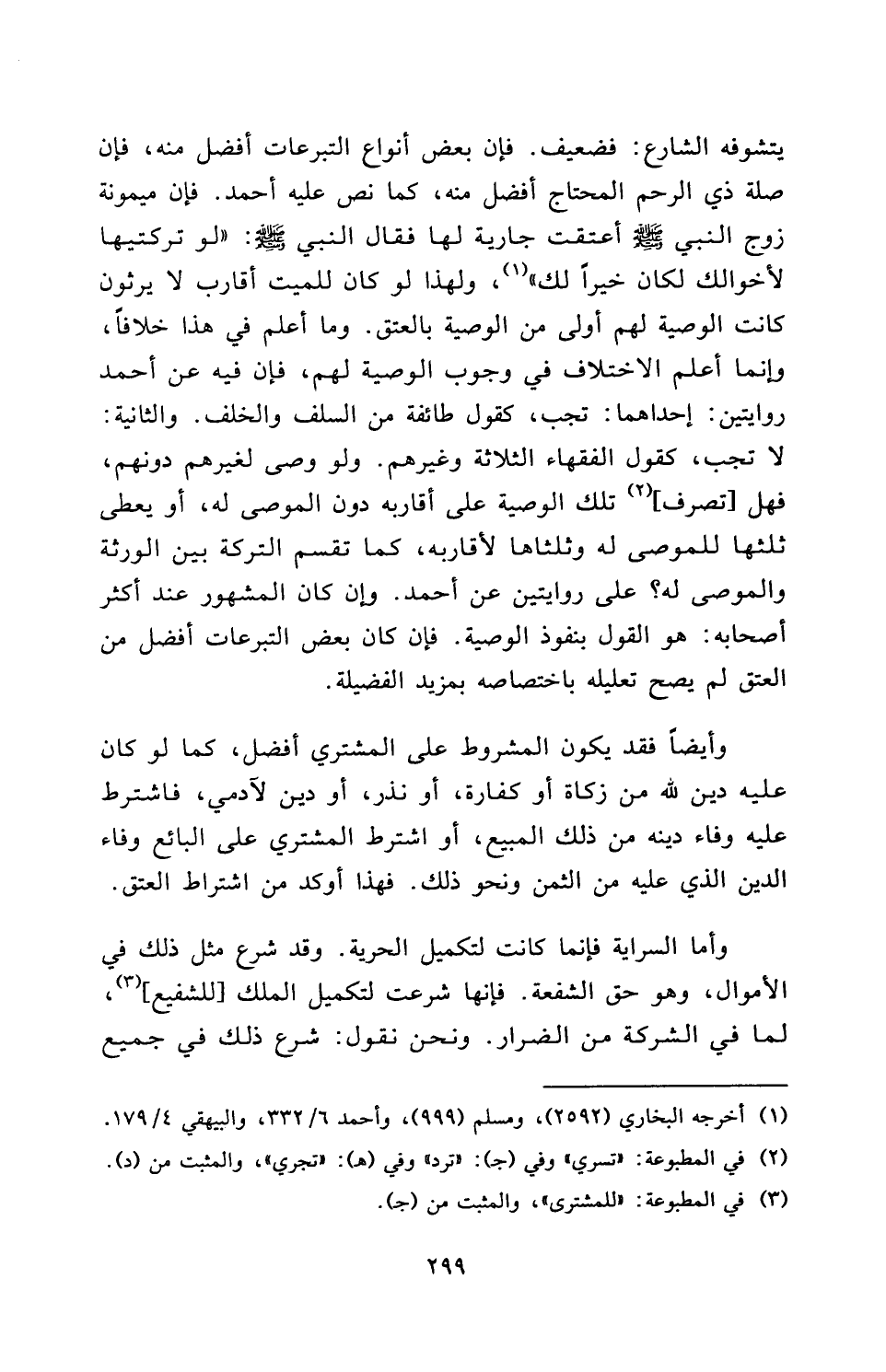 يَتَشَوَّفُهُ الشَّارِعُ فَضَعِيفٌ، فَإِنَّ بَعْضَ أَنْوَاعِ التَّبَرُّعَاتِ أَفْضَلُ مِنْهُ فَإِنَّ صِلَةَ ذِي الرَّحِمِ الْمُحْتَاجِ أَفْضَلُ مِنْهُ، كَمَا نَصَّ عَلَيْهِ أحمد. فَإِنَّ «ميمونة زَوْجَ النَّبِيِّ صَلَّى اللَّهُ عَلَيْهِ وَسَلَّمَ أَعْتَقَتْ جَارِيَةً لَهَا فَقَالَ النَّبِيُّ صَلَّى اللَّهُ عَلَيْهِ سَلَّمَ: لَوْ تَرَكْتِيهَا لِأَخْوَالِكِ لَكَانَ خَيْرًا لَكِ» ، وَلِهَذَا لَوْ كَانَ لِلْمَيِّتِ أَقَارِبُ لَا يَرِثُونَ كَانَتِ الْوَصِيَّةُ لَهُمْ أَوْلَى مِنَ الْوَصِيَّةِ بِالْعِتْقِ. وَمَا أَعْلَمُ فِي هَذَا خِلَافًا، وَإِنَّمَا أَعْلَمُ الِاخْتِلَافَ فِي وُجُوبِ الْوَصِيَّةِ لَهُمْ، فَإِنَّ فِيهِ عَنْ أحمد رِوَايَتَيْنِ، إِحْدَاهُمَا: تَجِبُ، كَقَوْلِ طَائِفَةٍ مِنَ السَّلَفِ وَالْخَلْفِ. وَالثَّانِيَةُ: لَا تَجِبُ، كَقَوْلِ الْفُقَهَاءِ الثَّلَاثَةِ وَغَيْرِهِمْ. وَلَوْ وَصَّى لِغَيْرِهِمْ دُونَهُمْ فَهَلْ [تُصْرَفُ] تِلْكَ الْوَصِيَّةُ عَلَى أَقَارِبِهِ دُونَ الْمُوصَى لَهُ، أَوْ يُعْطَى ثُلُثُهَا لِلْمُوصَى لَهُ وَثُلُثَاهَا لِأَقَارِبِهِ، كَمَا تُقَسَّمُ التَّرِكَةُ بَيْنَ الْوَرَثَةِ وَالْمُوصَى لَهُ؟ عَلَى رِوَايَتَيْنِ عَنْ أحمد. وَإِنْ كَانَ الْمَشْهُورُ عِنْدَ أَكْثَرِ أَصْحَابِهِ: هُوَ الْقَوْلُ بِنُفُوذِ الْوَصِيَّةِ. فَإِذَا كَانَ بَعْضُ التَّبَرُّعَاتِ أَفْضَلَ مِنَ الْعِتْقِ لَمْ يَصِحَّ تَعْلِيلُهُ بِاخْتِصَاصِهِ بِمَزِيدِ الْفَضِيلَةِ.