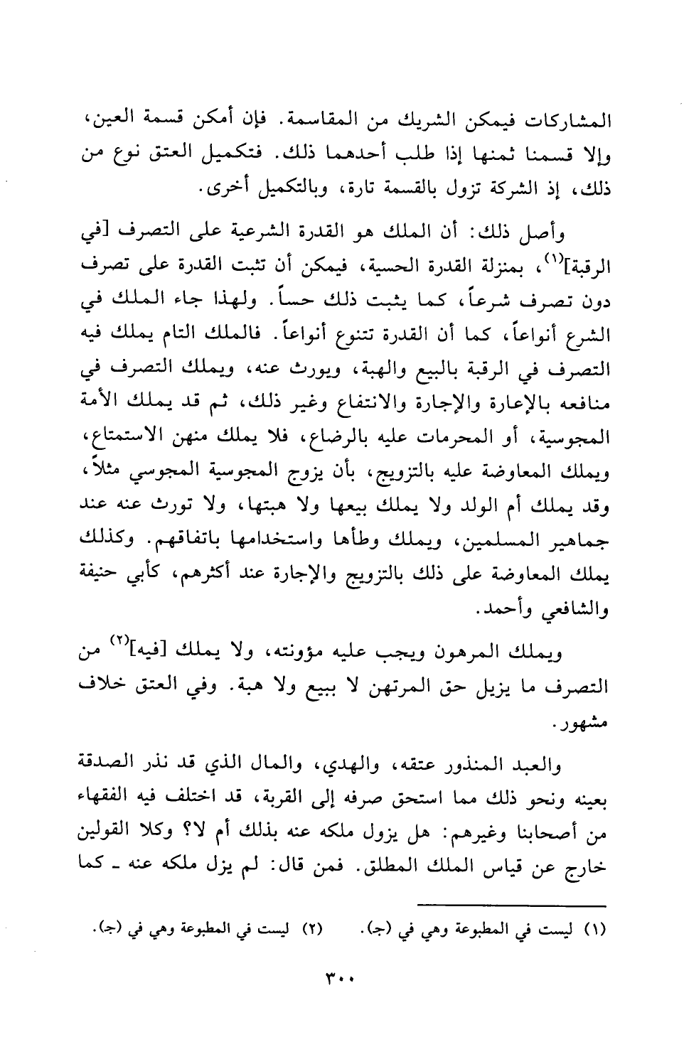 وَأَصْلُ ذَلِكَ: أَنَّ الْمِلْكَ هُوَ الْقُدْرَةُ الشَّرْعِيَّةُ عَلَى التَّصَرُّفِ [فِي الرَّقَبَةِ] ، بِمَنْزِلَةِ الْقُدْرَةِ الْحِسِّيَّةِ، فَيُمْكِنُ أَنْ تَثْبُتَ الْقُدْرَةُ عَلَى تَصَرُّفٍ دُونَ تَصَرُّفٍ شَرْعًا، كَمَا يَثْبُتُ ذَلِكَ حِسًّا. وَلِهَذَا جَاءَ الْمِلْكُ فِي الشَّرْعِ أَنْوَاعًا، كَمَا أَنَّ الْقُدْرَةَ تَتَنَوَّعُ أَنْوَاعًا. فَالْمِلْكُ التَّامُّ يَمْلِكُ فِيهِ التَّصَرُّفَ فِي الرَّقَبَةِ بِالْبَيْعِ وَالْهِبَةِ، وَيُورَثُ عَنْهُ، وَيَمْلِكُ التَّصَرُّفَ فِي مَنَافِعِهِ بِالْإِعَارَةِ وَالْإِجَارَةِ وَالِانْتِفَاعِ وَغَيْرِ ذَلِكَ، ثُمَّ قَدْ يَمْلِكُ الْأَمَةَ الْمَجُوسِيَّةَ، أَوِ الْمُحَرَّمَاتِ عَلَيْهِ بِالرَّضَاعِ، فَلَا يَمْلِكُ مِنْهُنَّ الِاسْتِمْتَاعَ، وَيَمْلِكُ الْمُعَاوَضَةَ عَلَيْهِ بِالتَّزْوِيجِ، بِأَنْ يُزَوِّجَ الْمَجُوسِيَّةَ الْمَجُوسِيَّ مَثَلًا، وَقَدْ يَمْلِكُ أَمَّ الْوَلَدِ وَلَا يَمْلِكُ بَيْعَهَا وَلَا هِبَتَهَا، وَلَا تُورَثُ عَنْهُ عِنْدَ جَمَاهِيرِ الْمُسْلِمِينَ، وَيَمْلِكُ وَطْأَهَا وَاسْتِخْدَامَهَا بِاتِّفَاقِهِمْ. وَكَذَلِكَ تُمْلَكُ الْمُعَاوَضَةُ عَلَى ذَلِكَ بِالتَّزْوِيجِ وَالْإِجَارَةِ عِنْدَ أَكْثَرِهِمْ كأبي حنيفة وَالشَّافِعِيِّ وأحمد.