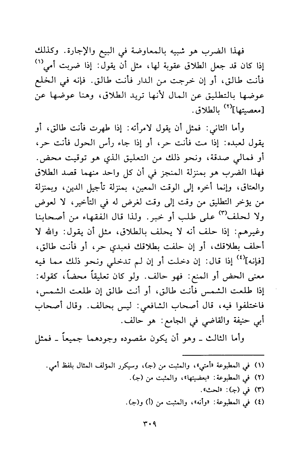وَأَمَّا الثَّانِي: فَمِثْلُ أَنْ يَقُولَ لِامْرَأَتِهِ: إِذَا طَهُرْتِ فَأَنْتِ طَالِقٌ، أَوْ يَقُولَ لِعَبْدِهِ: إِذَا مُتُّ فَأَنْتَ حُرٌّ، أَوْ إِذَا جَاءَ رَأْسُ الْحَوْلِ فَأَنْتَ حُرٌّ، أَوْ فَمَالِي صَدَقَةٌ، وَنَحْوَ ذَلِكَ مِنَ التَّعْلِيقِ الَّذِي هُوَ تَوْقِيتٌ مَحْضٌ. فَهَذَا الضَّرْبُ هُوَ بِمَنْزِلَةِ الْمُنَجَّزِ فِي أَنَّ كُلَّ وَاحِدٍ مِنْهُمَا قَصَدَ الطَّلَاقَ وَالْعِتَاقَ، وَإِنَّمَا أَخَّرَهُ إِلَى الْوَقْتِ الْمُعَيَّنِ، بِمَنْزِلَةِ تَأْجِيلِ الدَّيْنِ وَبِمَنْزِلَةِ مَنْ يُؤَخِّرُ التَّطْلِيقَ مِنْ وَقْتٍ إِلَى وَقْتٍ لِغَرَضٍ لَهُ فِي التَّأْخِيرِ، لَا لِعِوَضٍ وَلَا لِحَلِفٍ عَلَى طَلَبٍ أَوْ خَبَرٍ. وَلِهَذَا قَالَ الْفُقَهَاءُ مِنْ أَصْحَابِنَا وَغَيْرِهِمْ: إِذَا حَلَفَ أَنَّهُ لَا يَحْلِفُ بِالطَّلَاقِ، مِثْلَ أَنْ يَقُولَ: وَاللَّهِ لَا أَحْلِفُ بِطَلَاقِكِ، أَوْ إِنْ حَلَفْتُ بِطَلَاقِكِ فَعَبْدِي حُرٌّ، أَوْ فَأَنْتِ طَالِقٌ، [فَإِنَّهُ] إِذَا قَالَ: إِنْ دَخَلْتِ أَوْ إِنْ لَمْ تَدْخُلِي وَنَحْوَ ذَلِكَ مِمَّا فِيهِ مَعْنَى الْحَضِّ أَوِ الْمَنْعِ: فَهُوَ حَالِفٌ. وَلَوْ كَانَ تَعْلِيقًا مَحْضًا، كَقَوْلِهِ: إِذَا طَلَعَتِ الشَّمْسُ فَأَنْتِ طَالِقٌ، أَوْ أَنْتِ طَالِقٌ إِنْ طَلَعَتِ الشَّمْسُ، فَاخْتَلَفُوا فِيهِ، قَالَ أَصْحَابُ الشَّافِعِيِّ: لَيْسَ بِحَالِفٍ، وَقَالَ أَصْحَابُ أبي حنيفة وَالْقَاضِي فِي الْجَامِعِ: هُوَ حَالِفٌ.