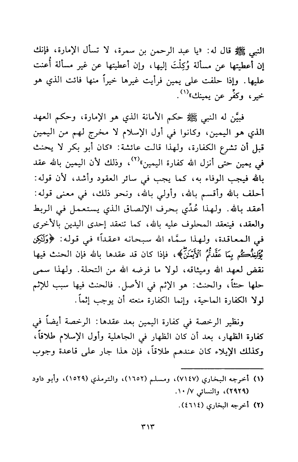 فَبَيَّنَ لَهُ النَّبِيُّ صَلَّى اللَّهُ عَلَيْهِ وَسَلَّمَ حُكْمَ الْأَمَانَةِ الَّذِي هُوَ الْإِمَارَةُ، وَحُكْمَ الْعَهْدِ الَّذِي هُوَ الْيَمِينُ، وَكَانُوا فِي أَوَّلِ الْإِسْلَامِ لَا مَخْرَجَ لَهُمْ مِنَ الْيَمِينِ قَبْلَ أَنْ تُشْرَعَ الْكَفَّارَةُ، وَلِهَذَا قَالَتْ عائشة: " كَانَ أبو بكر لَا يَحْنَثُ فِي يَمِينٍ حَتَّى أَنْزَلَ اللَّهُ كَفَّارَةَ الْيَمِينِ "، وَذَلِكَ لِأَنَّ الْيَمِينَ بِاللَّهِ عَقْدٌ بِاللَّهِ فَيَجِبُ الْوَفَاءُ بِهِ، كَمَا يَجِبُ فِي سَائِرِ الْعُقُودِ وَأَشَدُّ؛ لِأَنَّ قَوْلَهُ: أَحْلِفُ بِاللَّهِ، وَأُقْسِمُ بِاللَّهِ، وَأُولِي بِاللَّهِ وَنَحْوِ ذَلِكَ، فِي مَعْنَى قَوْلِهِ: أَعْقِدُ بِاللَّهِ. لِهَذَا عُدِّيَ بِحَرْفِ الْإِلْصَاقِ الَّذِي يُسْتَعْمَلُ فِي الرَّبْطِ وَالْعَقْدِ، فَيَنْعَقِدُ الْمَحْلُوفُ عَلَيْهِ بِاللَّهِ، كَمَا تَنْعَقِدُ إِحْدَى الْيَدَيْنِ بِالْأُخْرَى فِي الْمُعَاقَدَةِ، وَلِهَذَا سَمَّاهُ اللَّهُ سُبْحَانَهُ " عَقْدًا " فِي قَوْلِهِ: {وَلَكِنْ يُؤَاخِذُكُمْ بِمَا عَقَّدْتُمُ الْأَيْمَانَ} [المائدة: 89] ، فَإِذَا كَانَ قَدْ عَقَدَهَا بِاللَّهِ فَإِنَّ الْحِنْثَ فِيهَا نَقْضٌ لِعَهْدِ اللَّهِ وَمِيثَاقِهِ، لَوْلَا مَا فَرَضَهُ اللَّهُ مِنَ التَّحِلَّةِ. وَلِهَذَا سُمِّيَ حَلُّهَا حِنْثًا، وَالْحِنْثُ: هُوَ الْإِثْمُ فِي الْأَصْلِ. فَالْحِنْثُ فِيهَا سَبَبٌ لِلْإِثْمِ لَوْلَا الْكَفَّارَةُ الْمَاحِيَةُ، وَإِنَّمَا الْكَفَّارَةُ مَنَعَتْهُ أَنْ يُوجِبَ إِثْمًا.