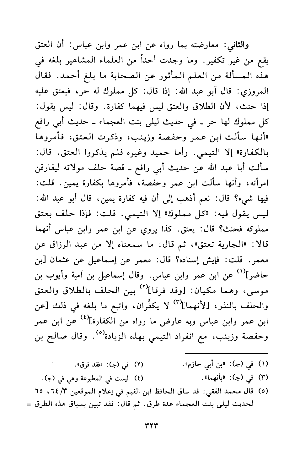 وَالثَّانِي: مُعَارَضَتُهُ بِمَا رَوَاهُ عَنِ ابْنِ عُمَرَ وَابْنِ عَبَّاسٍ: أَنَّ الْعِتْقَ يَقَعُ مِنْ غَيْرِ تَكْفِيرٍ. وَمَا وَجَدْتُ أَحَدًا مِنَ الْعُلَمَاءِ الْمَشَاهِيرِ بَلَغَهُ فِي هَذِهِ الْمَسْأَلَةِ مِنَ الْعِلْمِ الْمَأْثُورِ عَنِ الصَّحَابَةِ مَا بَلَغَ أحمد، فَقَالَ المروزي: قَالَ أبو عبد الله: إِذَا قَالَ: كُلُّ مَمْلُوكٍ لَهُ حُرٌّ، فَيَعْتِقُ عَلَيْهِ إِذَا حَنِثَ؛ لِأَنَّ الطَّلَاقَ وَالْعِتْقَ لَيْسَ فِيهِمَا كَفَّارَةٌ، وَقَالَ: لَيْسَ يَقُولُ: كُلُّ مَمْلُوكٍ لَهَا حُرٌّ، فِي حَدِيثِ ليلى بنت العجماء حَدِيثِ أبي رافع: " أَنَّهَا سَأَلَتِ ابْنَ عُمَرَ وحفصة وزينب، وَذَكَرَتِ الْعِتْقَ، فَأَمَرُوهَا بِالْكَفَّارَةِ " إِلَّا التَّيْمِيَّ. وَأَمَّا حميد وَغَيْرُهُ فَلَمْ يَذْكُرُوا الْعِتْقَ. قَالَ: سَأَلْتُ أبا عبد الله عَنْ حَدِيثِ أبي رافع، قِصَّةِ حَلِفِ مَوْلَاتِهِ لَيُفَارِقَنَّ امْرَأَتَهُ، وَأَنَّهَا سَأَلَتِ ابْنَ عُمَرَ وحفصة، فَأَمَرُوهَا بِكَفَّارَةِ يَمِينٍ. قُلْتُ: فِيهَا شَيْءٌ؟ قَالَ: نَعَمْ، أَذْهَبُ إِلَى أَنَّ فِيهِ كَفَّارَةَ يَمِينٍ، قَالَ أبو عبد الله: لَيْسَ يَقُولُ فِيهِ: " كُلُّ مَمْلُوكٍ " إِلَّا التَّيْمِيُّ. قُلْتُ: فَإِذَا حَلَفَ بِعِتْقِ مَمْلُوكِهِ فَحَنِثَ؟ قَالَ: يَعْتِقُ.