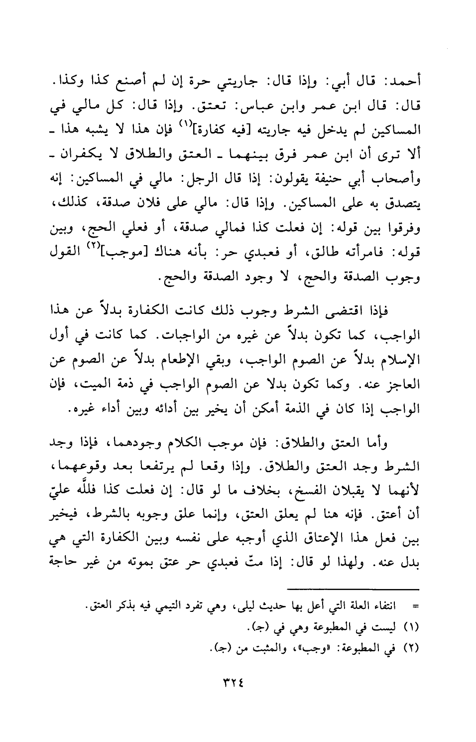 أحمد: قَالَ أَبِي: وَإِذَا قَالَ: جَارِيَتِي حُرَّةٌ إِنْ لَمْ أَصْنَعْ كَذَا وَكَذَا، قَالَ: قَالَ ابْنُ عُمَرَ وَابْنُ عَبَّاسٍ: تَعْتِقُ. وَإِذَا قَالَ: كُلُّ مَالِي فِي الْمَسَاكِينِ، لَمْ يَدْخُلْ فِيهِ جَارِيَتُهُ [فِيهِ كَفَّارَةٌ] ، فَإِنَّ هَذَا لَا يُشْبِهُ هَذَا - أَلَا تَرَى أَنَّ ابْنَ عُمَرَ فَرَّقَ بَيْنَهُمَا - الْعِتْقِ وَالطَّلَاقِ لَا يُكَفَّرَانِ - وَأَصْحَابُ أبي حنيفة يَقُولُونَ: إِذَا قَالَ الرَّجُلُ: مَالِي فِي الْمَسَاكِينِ: إِنَّهُ يَتَصَدَّقُ بِهِ عَلَى الْمَسَاكِينِ، وَإِذَا قَالَ: مَالِي عَلَى فُلَانٍ صَدَقَةٌ، كَذَلِكَ، وَفَرَّقُوا بَيْنَ قَوْلِهِ: إِنْ فَعَلْتُ كَذَا فَمَالِي صَدَقَةٌ، أَوْ فَعَلَيَّ الْحَجُّ، وَبَيْنَ قَوْلِهِ: فَامْرَأَتُهُ طَالِقٌ، أَوْ فَعَبْدِي حُرٌّ: بِأَنَّهُ هُنَاكَ [مُوجَبُ] الْقَوْلِ وُجُوبُ الصَّدَقَةِ وَالْحَجِّ، لَا وُجُودُ الصَّدَقَةِ وَالْحَجِّ.