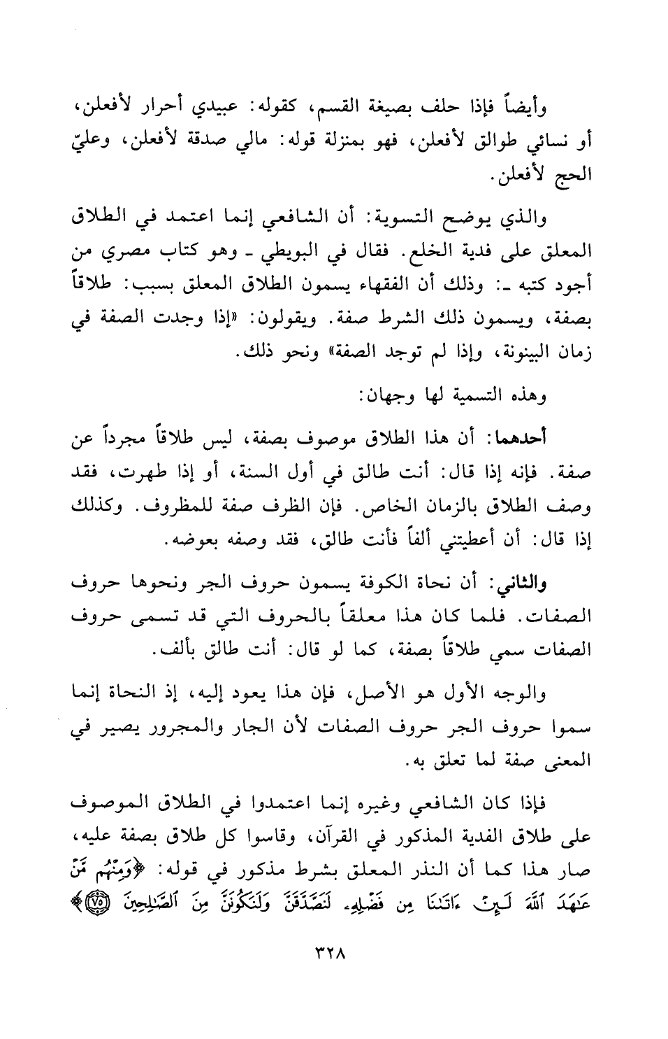 فَإِذَا كَانَ الشَّافِعِيُّ وَغَيْرُهُ إِنَّمَا اعْتَمَدُوا فِي الطَّلَاقِ الْمَوْصُوفِ عَلَى طَلَاقِ الْفِدْيَةِ الْمَذْكُورِ فِي الْقُرْآنِ، وَقَاسُوا كُلَّ طَلَاقٍ بِصِفَةٍ عَلَيْهِ، صَارَ هَذَا كَمَا أَنَّ النَّذْرَ الْمُعَلَّقَ بِشَرْطٍ مَذْكُورٍ فِي قَوْلِهِ: {وَمِنْهُمْ مَنْ عَاهَدَ اللَّهَ لَئِنْ آتَانَا مِنْ فَضْلِهِ لَنَصَّدَّقَنَّ وَلَنَكُونَنَّ مِنَ الصَّالِحِينَ} [التوبة: 75]