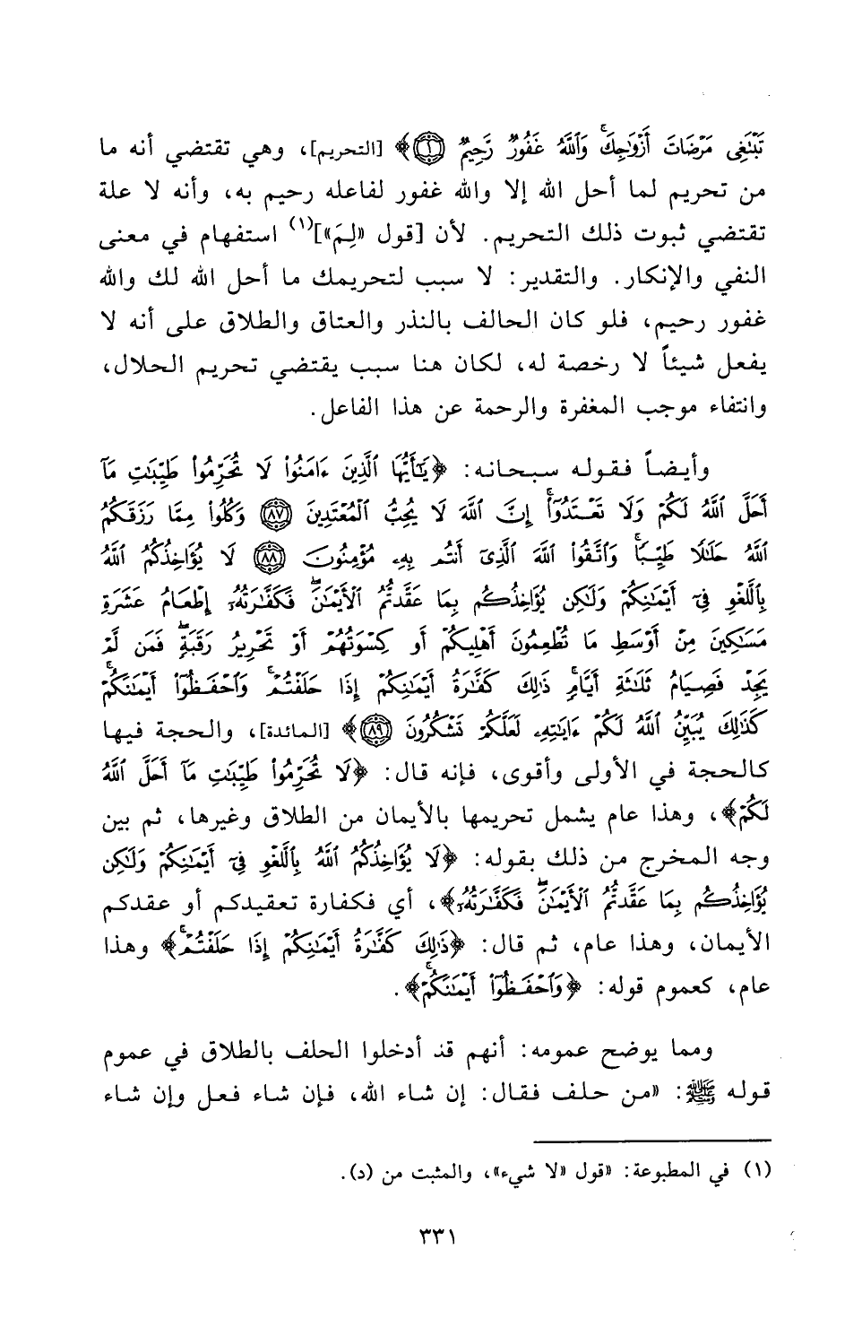 وَأَيْضًا فَقَوْلُهُ سُبْحَانَهُ: {يَاأَيُّهَا الَّذِينَ آمَنُوا لَا تُحَرِّمُوا طَيِّبَاتِ مَا أَحَلَّ اللَّهُ لَكُمْ وَلَا تَعْتَدُوا إِنَّ اللَّهَ لَا يُحِبُّ الْمُعْتَدِينَ - وَكُلُوا مِمَّا رَزَقَكُمُ اللَّهُ حَلَالًا طَيِّبًا وَاتَّقُوا اللَّهَ الَّذِي أَنْتُمْ بِهِ مُؤْمِنُونَ - لَا يُؤَاخِذُكُمُ اللَّهُ بِاللَّغْوِ فِي أَيْمَانِكُمْ وَلَكِنْ يُؤَاخِذُكُمْ بِمَا عَقَّدْتُمُ الْأَيْمَانَ فَكَفَّارَتُهُ إِطْعَامُ عَشَرَةِ مَسَاكِينَ مِنْ أَوْسَطِ مَا تُطْعِمُونَ أَهْلِيكُمْ أَوْ كِسْوَتُهُمْ أَوْ تَحْرِيرُ رَقَبَةٍ فَمَنْ لَمْ يَجِدْ فَصِيَامُ ثَلَاثَةِ أَيَّامٍ ذَلِكَ كَفَّارَةُ أَيْمَانِكُمْ إِذَا حَلَفْتُمْ وَاحْفَظُوا أَيْمَانَكُمْ كَذَلِكَ يُبَيِّنُ اللَّهُ لَكُمْ آيَاتِهِ لَعَلَّكُمْ تَشْكُرُونَ} [المائدة: 87 - 89] [الْمَائِدَةِ] ، وَالْحُجَّةُ فِيهَا كَالْحُجَّةِ فِي الْأُولَى وَأَقْوَى، فَإِنَّهُ قَالَ: {يَاأَيُّهَا الَّذِينَ آمَنُوا لَا تُحَرِّمُوا طَيِّبَاتِ مَا أَحَلَّ اللَّهُ لَكُمْ} [المائدة: 87] ، وَهَذَا عَامٌّ يَشْمَلُ تَحْرِيمَهَا بِالْأَيْمَانِ مِنَ الطَّلَاقِ وَغَيْرِهَا، ثُمَّ بَيَّنَ وَجْهَ الْمَخْرَجِ مِنْ ذَلِكَ بِقَوْلِهِ: {لَا يُؤَاخِذُكُمُ اللَّهُ بِاللَّغْوِ فِي أَيْمَانِكُمْ وَلَكِنْ يُؤَاخِذُكُمْ بِمَا عَقَّدْتُمُ الْأَيْمَانَ فَكَفَّارَتُهُ} [المائدة: 89] ، أَيْ: فَكَفَّارَةُ تَعْقِيدِكُمْ أَوْ عَقْدِكُمُ الْأَيْمَانَ، وَهَذَا عَامٌّ، ثُمَّ قَالَ: {ذَلِكَ كَفَّارَةُ أَيْمَانِكُمْ إِذَا حَلَفْتُمْ} [المائدة: 89] ، وَهَذَا عَامٌّ كَعُمُومِ قَوْلِهِ: {وَاحْفَظُوا أَيْمَانَكُمْ} [المائدة: 89] .