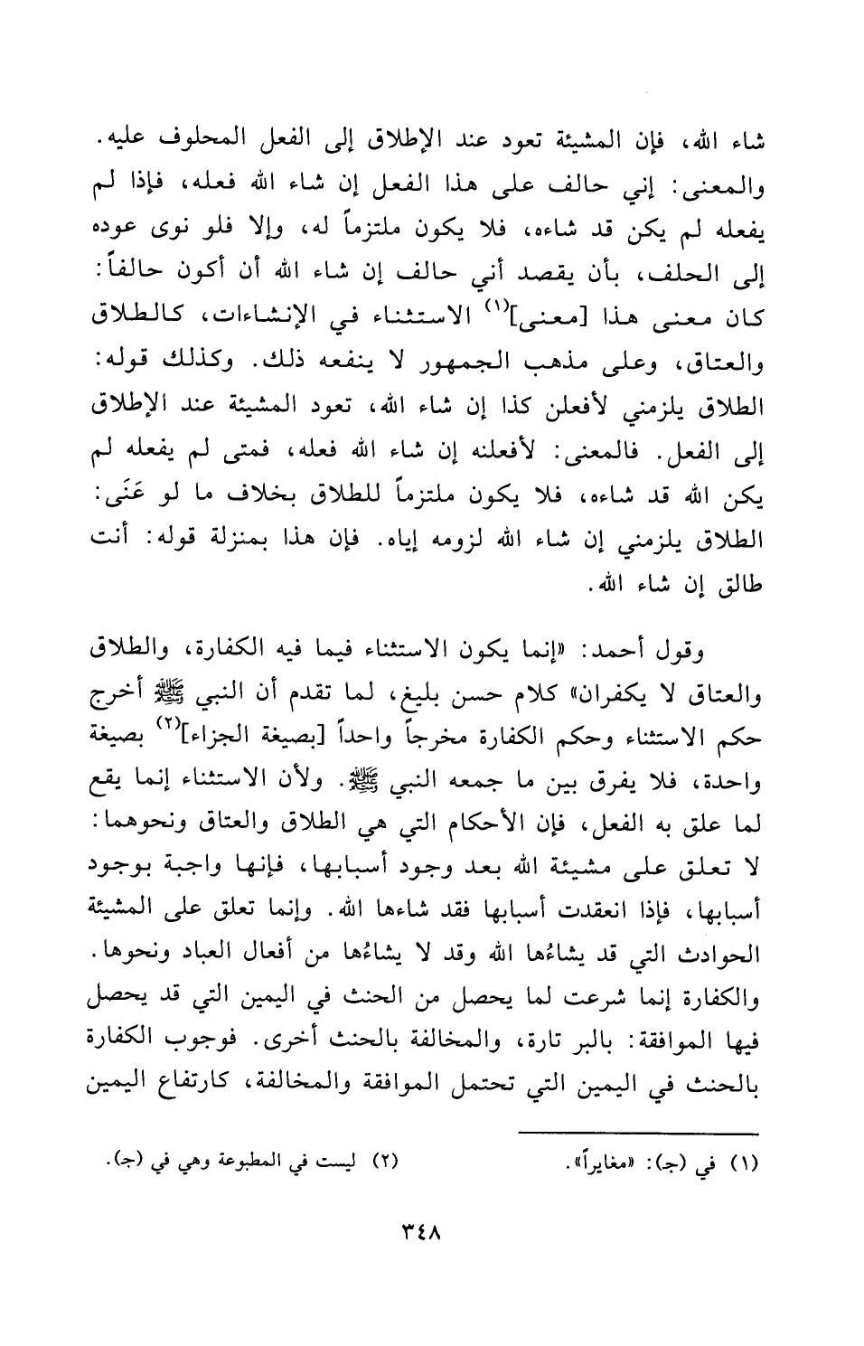 وَقَوْلُ أحمد: " إِنَّمَا يَكُونُ الِاسْتِثْنَاءُ فِيمَا فِيهِ الْكَفَّارَةُ، وَالطَّلَاقُ وَالْعَتَاقُ لَا يُكَفَّرَانِ " كَلَامٌ حَسَنٌ بَلِيغٌ، لِمَا تَقَدَّمَ أَنَّ النَّبِيَّ - صَلَّى اللَّهُ عَلَيْهِ وَسَلَّمَ - أَخْرَجَ حُكْمَ الِاسْتِثْنَاءِ وَحُكْمَ الْكَفَّارَةِ مَخْرَجًا وَاحِدًا [بِصِيغَةِ الْجَزَاءِ] بِصِيغَةٍ وَاحِدَةٍ، فَلَا يُفَرَّقُ بَيْنَ مَا جَمَعَهُ النَّبِيُّ - صَلَّى اللَّهُ عَلَيْهِ وَسَلَّمَ - وَلِأَنَّ الِاسْتِثْنَاءَ إِنَّمَا يَقَعُ لِمَا عَلَّقَ بِهِ الْفِعْلَ، فَإِنَّ الْأَحْكَامَ الَّتِي هِيَ الطَّلَاقُ وَالْعَتَاقُ وَنَحْوُهُمَا: لَا تُعَلَّقُ عَلَى مَشِيئَةِ اللَّهِ بَعْدَ وُجُودِ أَسْبَابِهَا، فَإِنَّهَا وَاجِبَةٌ بِوُجُودِ أَسْبَابِهَا، فَإِذَا انْعَقَدَتْ أَسْبَابُهَا فَقَدْ شَاءَهَا اللَّهُ. وَإِنَّمَا تُعَلَّقُ عَلَى الْمَشِيئَةِ الْحَوَادِثُ الَّتِي قَدْ يَشَاؤُهَا اللَّهُ وَقَدْ لَا يَشَاؤُهَا مِنْ أَفْعَالِ الْعِبَادِ وَنَحْوِهَا. وَالْكَفَّارَةُ إِنَّمَا شُرِعَتْ لِمَا يَحْصُلُ مِنَ الْحِنْثِ فِي الْيَمِينِ الَّتِي قَدْ يَحْصُلُ فِيهَا الْمُوَافَقَةُ: بِالْبِرِّ تَارَةً، وَالْمُخَالَفَةِ بِالْحِنْثِ أُخْرَى. فَوُجُوبُ الْكَفَّارَةِ بِالْحِنْثِ فِي الْيَمِينِ الَّتِي تَحْتَمِلُ الْمُوَافَقَةَ وَالْمُخَالَفَةَ، كَارْتِفَاعِ الْيَمِينِ