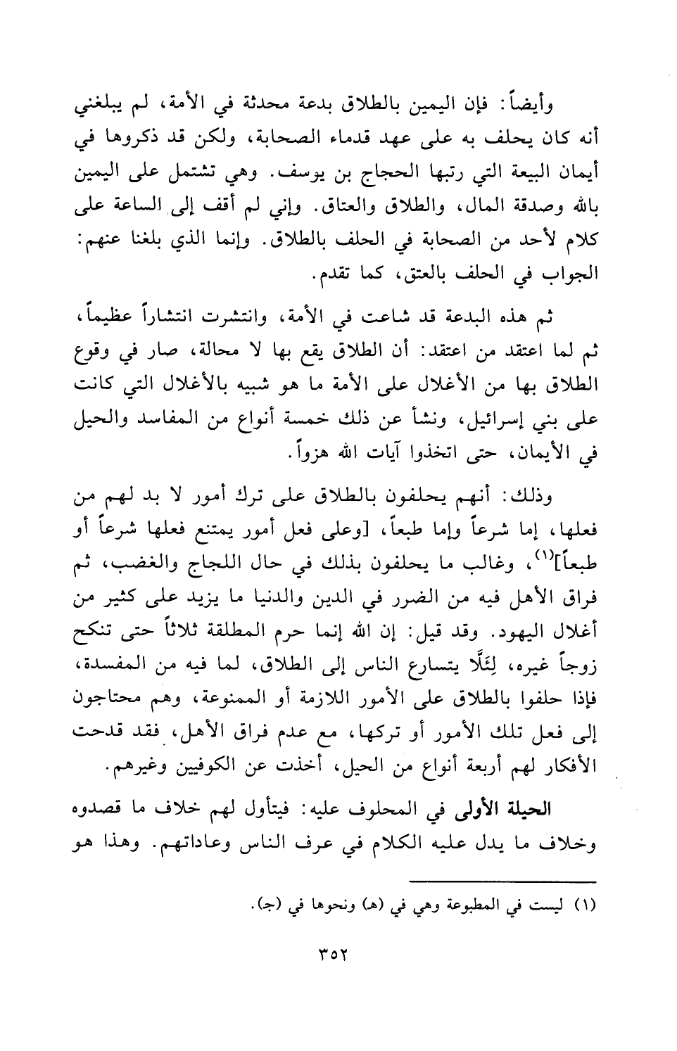 وَذَلِكَ: أَنَّهُمْ يَحْلِفُونَ بِالطَّلَاقِ عَلَى تَرْكِ أُمُورٍ لَا بُدَّ لَهُمْ مِنْ فِعْلِهَا، إِمَّا شَرْعًا وَإِمَّا طَبْعًا [وَعَلَى فِعْلِ أُمُورٍ يَمْتَنِعُ فِعْلُهَا شَرْعًا أَوْ طَبْعًا] وَغَالِبُ مَا يَحْلِفُونَ بِذَلِكَ فِي حَالِ اللَّجَاجِ وَالْغَضَبِ، ثُمَّ فِرَاقُ الْأَهْلِ فِيهِ مِنَ الضَّرَرِ فِي الدِّينِ وَالدُّنْيَا مَا يَزِيدُ عَلَى كَثِيرٍ مِنْ أَغْلَالِ الْيَهُودِ. وَقَدْ قِيلَ: إِنَّ اللَّهَ إِنَّمَا حَرَّمَ الْمُطَلَّقَةَ ثَلَاثًا حَتَّى تَنْكِحَ زَوْجًا غَيْرَهُ، لِئَلَّا يَتَسَارَعَ النَّاسُ إِلَى الطَّلَاقِ، لِمَا فِيهِ مِنَ الْمَفْسَدَةِ، فَإِذَا حَلَفُوا بِالطَّلَاقِ عَلَى الْأُمُورِ اللَّازِمَةِ أَوِ الْمَمْنُوعَةِ، وَهُمْ مُحْتَاجُونَ إِلَى فِعْلِ تِلْكَ الْأُمُورِ أَوْ تَرْكِهَا مَعَ عَدَمِ فِرَاقِ الْأَهْلِ، فَقَدْ قَدَحَتِ الْأَفْكَارُ لَهُمْ أَرْبَعَةَ أَنْوَاعٍ مِنَ الْحِيَلِ، أُخِذَتْ عَنِ الْكُوفِيِّينَ وَغَيْرِهِمْ: