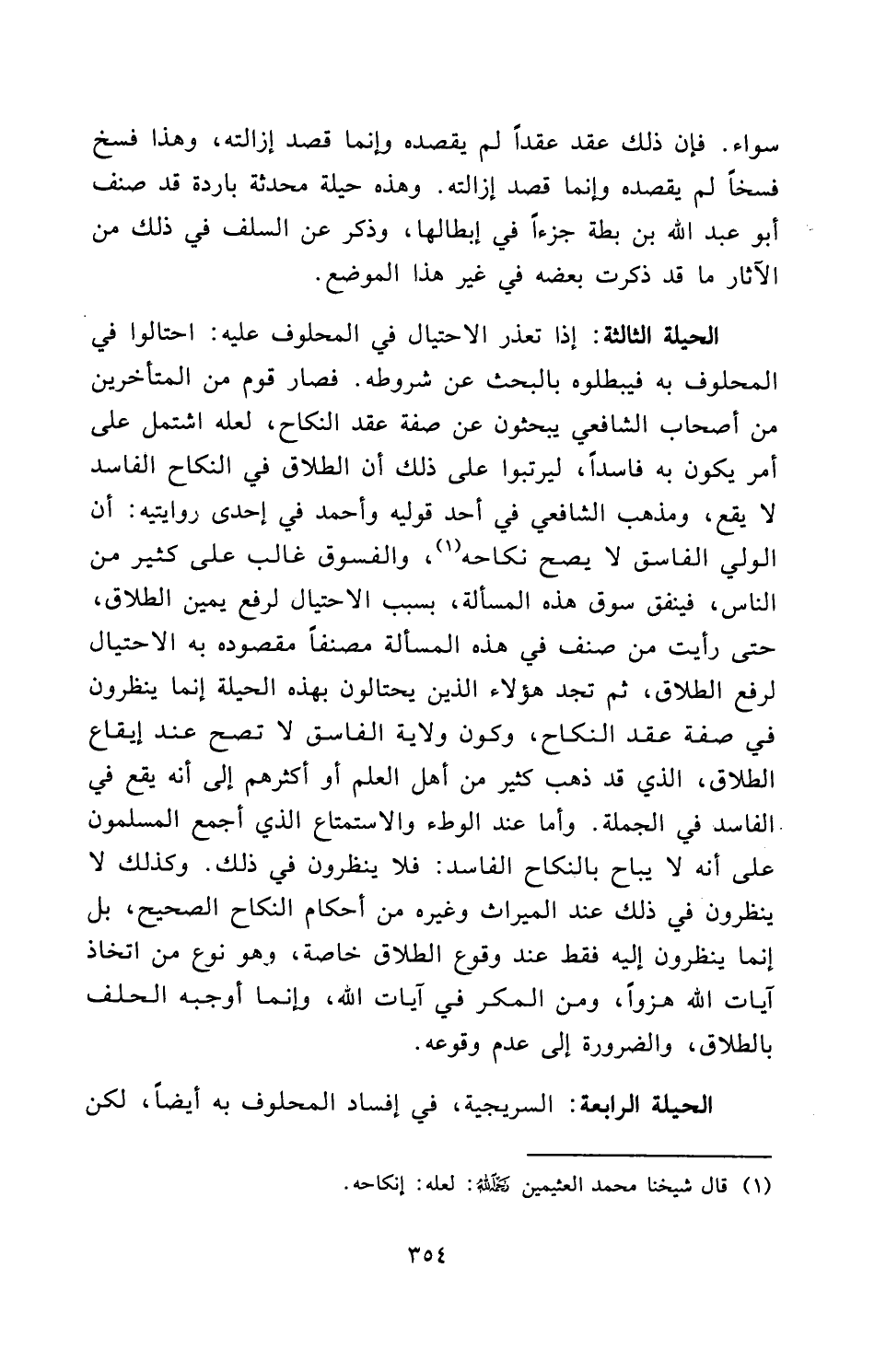 الْحِيلَةُ الثَّالِثَةُ: إِذَا تَعَذَّرَ الِاحْتِيَالُ فِي الْمَحْلُوفِ عَلَيْهِ احْتَالُوا فِي الْمَحْلُوفِ بِهِ فَيُبْطِلُوهُ بِالْبَحْثِ عَنْ شُرُوطِهِ، فَصَارَ قَوْمٌ مِنَ الْمُتَأَخِّرِينَ مِنْ أَصْحَابِ الشَّافِعِيِّ يَبْحَثُونَ عَنْ صِفَةِ عَقْدِ النِّكَاحِ، لَعَلَّهُ اشْتَمَلَ عَلَى أَمْرٍ يَكُونُ بِهِ فَاسِدًا، لِيُرَتِّبُوا عَلَى ذَلِكَ أَنَّ الطَّلَاقَ فِي النِّكَاحِ الْفَاسِدِ لَا يَقَعُ، وَمَذْهَبُ الشَّافِعِيِّ فِي أَحَدِ قَوْلَيْهِ وأحمد فِي إِحْدَى رِوَايَتَيْهِ: أَنَّ الْوَلِيَّ الْفَاسِقَ لَا يَصِحُّ نِكَاحُهُ، وَالْفُسُوقُ غَالِبٌ عَلَى كَثِيرٍ مِنَ النَّاسِ، فَيَنْفُقُ سُوقُ هَذِهِ الْمَسْأَلَةِ، بِسَبَبِ الِاحْتِيَالِ لِرَفْعِ يَمِينِ الطَّلَاقِ، حَتَّى رَأَيْتُ مَنْ صَنَّفَ فِي هَذِهِ الْمَسْأَلَةِ مُصَنَّفًا مَقْصُودُهُ بِهِ الِاحْتِيَالُ لِرَفْعِ الطَّلَاقِ، ثُمَّ تَجِدُ هَؤُلَاءِ الَّذِينَ يَحْتَالُونَ بِهَذِهِ الْحِيلَةِ إِنَّمَا يَنْظُرُونَ فِي صِفَةِ عَقْدِ النِّكَاحِ، وَكَوْنِ وِلَايَةِ الْفَاسِقِ لَا تَصِحُّ عِنْدَ إِيقَاعِ الطَّلَاقِ، الَّذِي قَدْ ذَهَبَ كَثِيرٌ مِنْ أَهْلِ الْعِلْمِ أَوْ أَكْثَرُهُمْ إِلَى أَنَّهُ يَقَعُ فِي الْفَاسِدِ فِي الْجُمْلَةِ. وَأَمَّا عِنْدَ الْوَطْءِ وَالِاسْتِمْتَاعِ الَّذِي أَجْمَعَ الْمُسْلِمُونَ عَلَى أَنَّهُ لَا يُبَاحُ بِالنِّكَاحِ الْفَاسِدِ: فَلَا يَنْظُرُونَ فِي ذَلِكَ، وَكَذَلِكَ لَا يَنْظُرُونَ فِي ذَلِكَ عِنْدَ الْمِيرَاثِ وَغَيْرِهِ مِنْ أَحْكَامِ النِّكَاحِ الصَّحِيحِ، بَلْ إِنَّمَا يَنْظُرُونَ إِلَيْهِ فَقَطْ عِنْدَ وُقُوعِ الطَّلَاقِ خَاصَّةً، وَهُوَ نَوْعٌ مِنِ اتِّخَاذِ آيَاتِ اللَّهِ هُزُوًا، وَمِنَ الْمَكْرِ فِي آيَاتِ اللَّهِ، وَإِنَّمَا أَوْجَبَهُ الْحَلِفُ بِالطَّلَاقِ وَالضَّرُورَةُ إِلَى عَدَمِ وُقُوعِهِ.