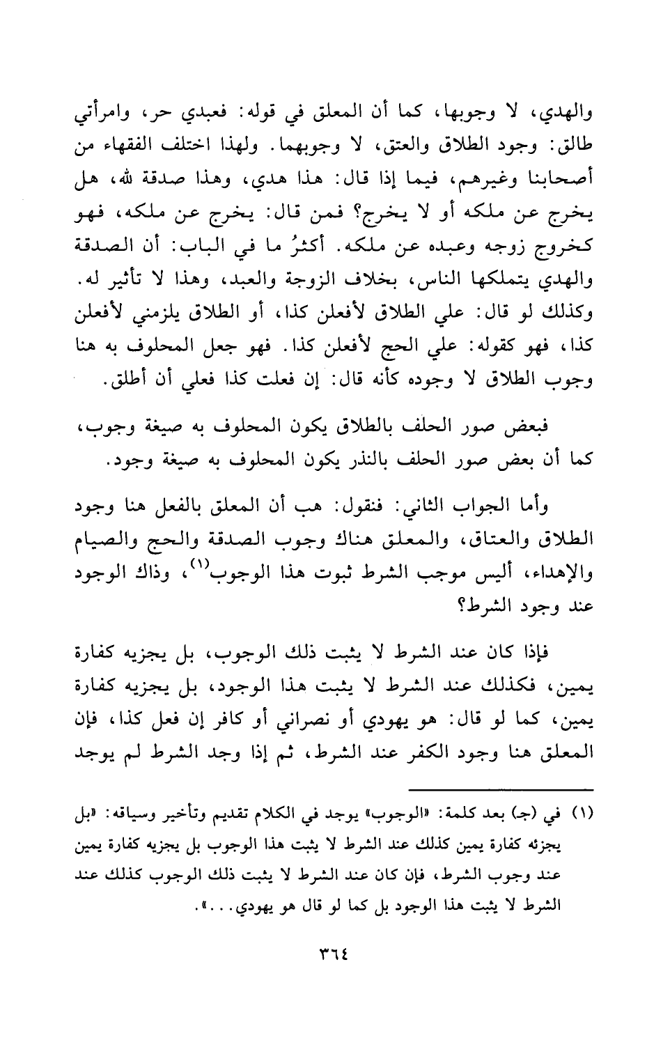 وَأَمَّا الْجَوَابُ الثَّانِي: فَنَقُولُ: هَبْ أَنَّ الْمُعَلَّقَ بِالْفِعْلِ هُنَا وُجُودُ الطَّلَاقِ وَالْعَتَاقِ، وَالْمُعَلَّقَ هُنَاكَ وُجُوبُ الصَّدَقَةِ وَالْحَجِّ وَالصِّيَامِ وَالْإِهْدَاءِ، أَلَيْسَ مُوجَبُ الشَّرْطِ ثُبُوتَ هَذَا الْوُجُوبِ وَذَاكَ الْوُجُودِ عِنْدَ وُجُودِ الشَّرْطِ؟