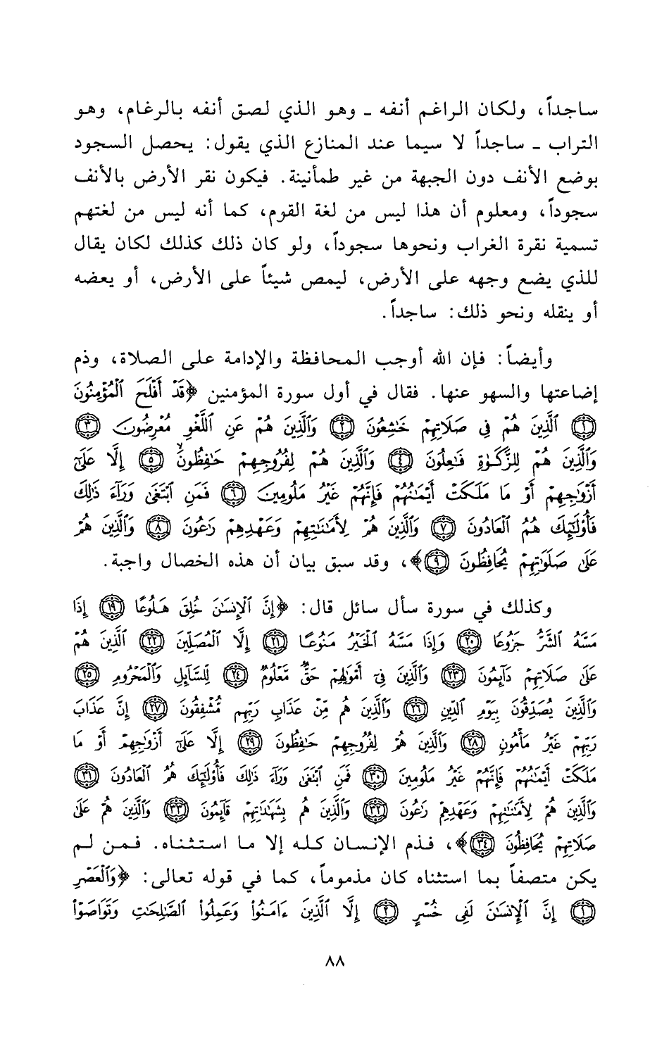 وَأَيْضًا: فَإِنَّ اللَّهَ أَوْجَبَ الْمُحَافَظَةَ وَالْإِدَامَةَ عَلَى الصَّلَاةِ، وَذَمَّ إِضَاعَتَهَا وَالسَّهْوَ عَنْهَا، فَقَالَ فِي أَوَّلِ سُورَةِ الْمُؤْمِنُونَ: {قَدْ أَفْلَحَ الْمُؤْمِنُونَ - الَّذِينَ هُمْ فِي صَلَاتِهِمْ خَاشِعُونَ - وَالَّذِينَ هُمْ عَنِ اللَّغْوِ مُعْرِضُونَ - وَالَّذِينَ هُمْ لِلزَّكَاةِ فَاعِلُونَ - وَالَّذِينَ هُمْ لِفُرُوجِهِمْ حَافِظُونَ - إِلَّا عَلَى أَزْوَاجِهِمْ أوْ مَا مَلَكَتْ أَيْمَانُهُمْ فَإِنَّهُمْ غَيْرُ مَلُومِينَ - فَمَنِ ابْتَغَى وَرَاءَ ذَلِكَ فَأُولَئِكَ هُمُ الْعَادُونَ - وَالَّذِينَ هُمْ لِأَمَانَاتِهِمْ وَعَهْدِهِمْ رَاعُونَ - وَالَّذِينَ هُمْ عَلَى صَلَوَاتِهِمْ يُحَافِظُونَ} [المؤمنون: 1 - 9] وَقَدْ سَبَقَ بَيَانُ أَنَّ هَذِهِ الْخِصَالَ وَاجِبَةٌ.