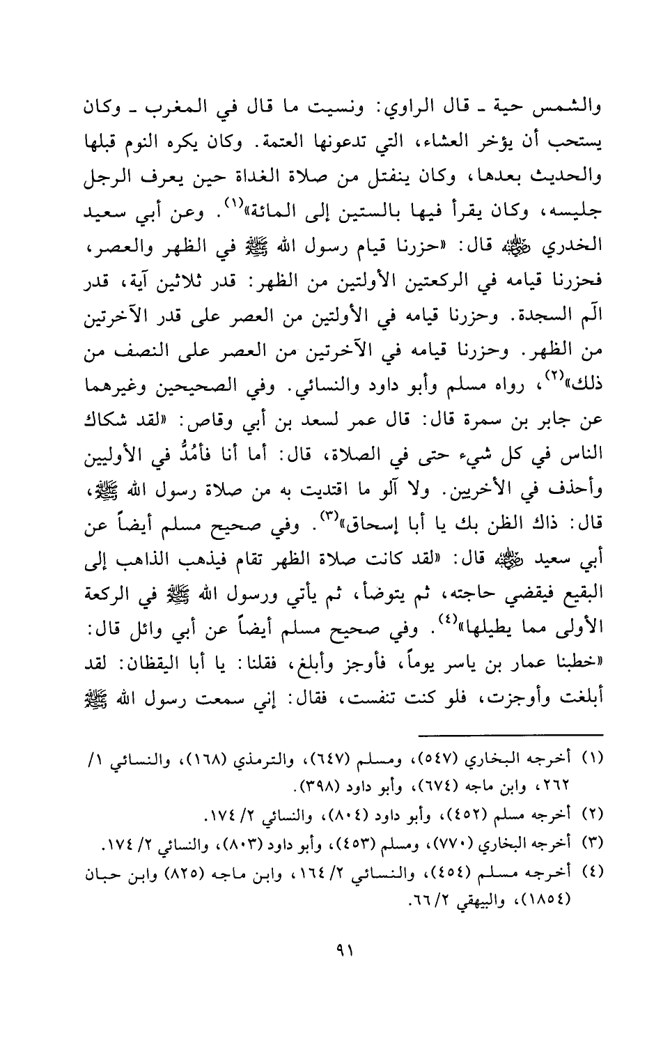 وَالشَّمْسُ حَيَّةٌ - قَالَ الرَّاوِي: وَنَسِيتُ مَا قَالَ فِي الْمَغْرِبِ - وَكَانَ يَسْتَحِبُّ أَنْ يُؤَخِّرَ الْعِشَاءَ الَّتِي تَدْعُونَهَا الْعَتَمَةَ، وَكَانَ يَكْرَهُ النَّوْمَ قَبْلَهَا وَالْحَدِيثَ بَعْدَهَا، وَكَانَ يَنْفَتِلُ مِنْ صَلَاةِ الْغَدَاةِ حِينَ يَعْرِفُ الرَّجُلُ جَلِيسَهُ، وَكَانَ يَقْرَأُ فِيهَا بِالسِّتِّينَ إِلَى الْمِائَةِ» "، وَعَنْ أَبِي سَعِيدٍ الْخُدْرِيِّ رَضِيَ اللَّهُ عَنْهُ قَالَ: " «حَزَرْنَا قِيَامَ رَسُولِ اللَّهِ صَلَّى اللَّهُ عَلَيْهِ وَسَلَّمَ فِي الظُّهْرِ وَالْعَصْرِ، فَحَزَرْنَا قِيَامَهُ فِي الرَّكْعَتَيْنِ الْأُولَتَيْنِ مِنَ الظُّهْرِ قَدْرَ ثَلَاثِينَ آيَةً، قَدْرَ الم السَّجْدَةِ، وَحَزَرْنَا قِيَامَهُ فِي الْأُولَتَيْنِ مِنَ الْعَصْرِ عَلَى قَدْرِ الْآخِرَتَيْنِ مِنَ الظُّهْرِ، وَحَزَرْنَا قِيَامَهُ فِي الْآخِرَتَيْنِ مِنَ الْعَصْرِ عَلَى النِّصْفِ مِنْ ذَلِكَ» "، رَوَاهُ مسلم وأبو داود وَالنَّسَائِيُّ، وَفِي الصَّحِيحَيْنِ وَغَيْرِهِمَا عَنْ جَابِرِ بْنِ سَمُرَةَ قَالَ: قَالَ عمر لِسَعْدِ بْنِ أَبِي وَقَّاصٍ: " «لَقَدْ شَكَاكَ النَّاسُ فِي كُلِّ شَيْءٍ حَتَّى فِي الصَّلَاةِ، قَالَ: أَمَّا أَنَا فَأَمُدُّ فِي الْأُولَيَيْنِ وَأَحْذِفُ فِي الْأُخْرَيَيْنِ وَلَا آلُو مَا اقْتَدَيْتُ بِهِ مِنْ صَلَاةِ رَسُولِ اللَّهِ صَلَّى اللَّهُ عَلَيْهِ وَسَلَّمَ، قَالَ: ذَاكَ الظَّنُّ بِكَ يَا أَبَا إِسْحَاقَ» " وَفِي صَحِيحِ مسلم أَيْضًا عَنْ أبي سعيد رَضِيَ اللَّهُ عَنْهُ قَالَ: " «لَقَدْ كَانَتْ صَلَاةُ الظُّهْرِ تُقَامُ فَيَذْهَبُ الذَّاهِبُ إِلَى الْبَقِيعِ فَيَقْضِي حَاجَتَهُ ثُمَّ يَتَوَضَّأُ ثُمَّ يَأْتِي وَرَسُولُ اللَّهِ صَلَّى اللَّهُ عَلَيْهِ وَسَلَّمَ فِي الرَّكْعَةِ الْأُولَى مِمَّا يُطِيلُهَا» " وَفِي صَحِيحِ مسلم أَيْضًا عَنْ أبي وائل قَالَ: " «خَطَبَنَا عَمَّارُ بْنُ يَاسِرٍ يَوْمًا فَأَوْجَزَ وَأَبْلَغَ، فَقُلْنَا: يَا أبا اليقظان لَقَدْ أَبْلَغْتَ وَأَوْجَزْتَ، فَلَوْ كُنْتَ تَنَفَّسْتَ، فَقَالَ: إِنِّي سَمِعْتُ رَسُولَ اللَّهِ صَلَّى اللَّهُ عَلَيْهِ وَسَلَّمَ