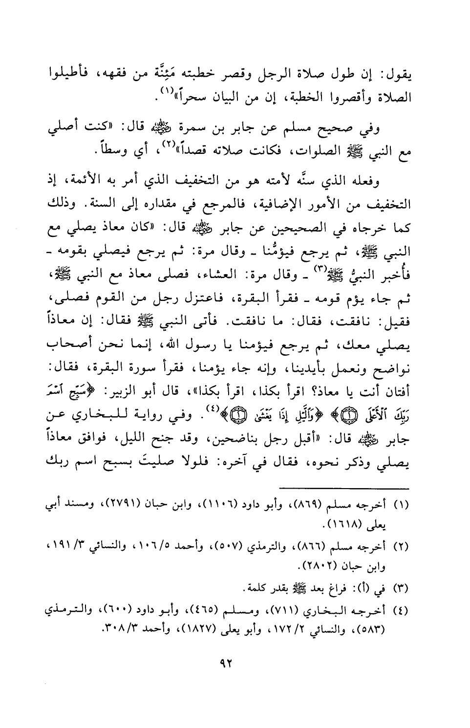 وَفِعْلُهُ الَّذِي سَنَّهُ لِأُمَّتِهِ هُوَ مِنَ التَّخْفِيفِ الَّذِي أَمَرَ بِهِ الْأَئِمَّةَ، إِذِ التَّخْفِيفُ مِنَ الْأُمُورِ الْإِضَافِيَّةِ، فَالْمَرْجِعُ فِي مِقْدَارِهِ إِلَى السُّنَّةِ، وَذَلِكَ كَمَا خَرَّجَاهُ فِي الصَّحِيحَيْنِ عَنْ جابر رَضِيَ اللَّهُ عَنْهُ قَالَ: " «كَانَ معاذ يُصَلِّي مَعَ النَّبِيِّ صَلَّى اللَّهُ عَلَيْهِ وَسَلَّمَ ثُمَّ يَرْجِعُ فَيَؤُمُّنَا - وَقَالَ مَرَّةً: ثُمَّ يَرْجِعُ فَيُصَلِّي بِقَوْمِهِ - فَأُخْبِرَ النَّبِيُّ صَلَّى اللَّهُ عَلَيْهِ وَسَلَّمَ - وَقَالَ مَرَّةً: الْعِشَاءَ - فَصَلَّى معاذ مَعَ النَّبِيِّ صَلَّى اللَّهُ عَلَيْهِ وَسَلَّمَ ثُمَّ جَاءَ يَؤُمُّ قَوْمَهُ - فَقَرَأَ الْبَقَرَةَ فَاعْتَزَلَ رَجُلٌ مِنَ الْقَوْمِ فَصَلَّى، فَقِيلَ: نَافَقْتَ، فَقَالَ: مَا نَافَقْتُ، فَأَتَى النَّبِيَّ صَلَّى اللَّهُ عَلَيْهِ وَسَلَّمَ، فَقَالَ: إِنَّ معاذا يُصَلِّي مَعَكَ ثُمَّ يَرْجِعُ فَيَؤُمُّنَا يَا رَسُولَ اللَّهِ، إِنَّمَا نَحْنُ أَصْحَابُ نَوَاضِحَ وَنَعْمَلُ بِأَيْدِينَا وَإِنَّهُ جَاءَ يَؤُمُّنَا فَقَرَأَ سُورَةَ الْبَقَرَةِ، فَقَالَ: أَفَتَّانٌ أَنْتَ يَا معاذ؟ اقْرَأْ بِكَذَا، اقْرَأْ بِكَذَا " قَالَ أبو الزبير: {سَبِّحِ اسْمَ رَبِّكَ الْأَعْلَى} [الأعلى: 1] ، {وَاللَّيْلِ إِذَا يَغْشَى} [الليل: 1] » ، وَفِي رِوَايَةٍ لِلْبُخَارِيِّ عَنْ جابر رَضِيَ اللَّهُ عَنْهُ قَالَ: " أَقْبَلَ رَجُلٌ بِنَاضِحَيْنِ، وَقَدْ جَنَحَ اللَّيْلُ فَوَافَقَ معاذا يُصَلِّي " وَذَكَرَهُ نَحْوَهُ، فَقَالَ فِي آخِرِهِ: " «فَلَوْلَا صَلَّيْتَ بِسَبِّحِ اسْمَ رَبِّكَ