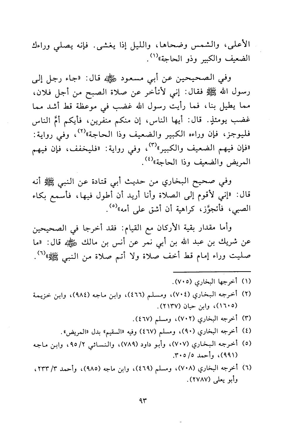 وَفِي الصَّحِيحَيْنِ عَنْ أبي مسعود رَضِيَ اللَّهُ عَنْهُ قَالَ: " «جَاءَ رَجُلٌ إِلَى رَسُولِ اللَّهِ صَلَّى اللَّهُ عَلَيْهِ وَسَلَّمَ، فَقَالَ: إِنِّي لَأَتَأَخَّرُ عَنْ صَلَاةِ الصُّبْحِ مِنْ أَجْلِ فُلَانٍ مِمَّا يُطِيلُ بِنَا، فَمَا رَأَيْتُ رَسُولَ اللَّهِ غَضِبَ فِي مَوْعِظَةٍ قَطُّ أَشَدَّ مِمَّا غَضِبَ يَوْمَئِذٍ. قَالَ: أَيُّهَا النَّاسُ إِنَّ مِنْكُمْ مُنَفِّرِينَ، فَأَيُّكُمْ أَمَّ النَّاسَ فَلْيُوجِزْ؛ فَإِنَّ وَرَاءَهُ الْكَبِيرَ وَالضَّعِيفَ وَذَا الْحَاجَةِ» " وَفِي رِوَايَةٍ: " فَإِنَّ فِيهِمُ الضَّعِيفَ وَالْكَبِيرَ " وَفِي رِوَايَةٍ: " «فَلْيُخَفِّفْ فَإِنَّ فِيهِمُ الْمَرِيضَ وَالضَّعِيفَ وَذَا الْحَاجَةِ» ".