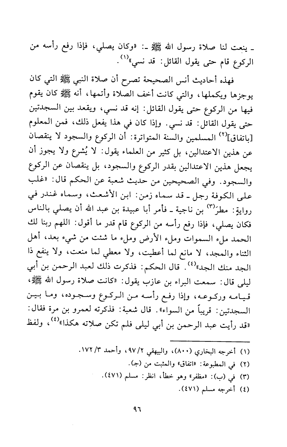 فَهَذِهِ أَحَادِيثُ أنس الصَّحِيحَةُ تُصَرِّحُ أَنَّ صَلَاةَ النَّبِيِّ صَلَّى اللَّهُ عَلَيْهِ وَسَلَّمَ الَّتِي كَانَ يُوجِزُهَا وَيُكْمِلُهَا، وَالَّتِي كَانَتْ أَخَفَّ الصَّلَاةِ وَأَتَمَّهَا، أَنَّهُ صَلَّى اللَّهُ عَلَيْهِ وَسَلَّمَ كَانَ يَقُومُ فِيهَا مِنَ الرُّكُوعِ حَتَّى يَقُولَ الْقَائِلُ: إِنَّهُ قَدْ نَسِيَ، وَيَقْعُدُ بَيْنَ السَّجْدَتَيْنِ حَتَّى يَقُولَ الْقَائِلُ: قَدْ نَسِيَ، وَإِذَا كَانَ فِي هَذَا يَفْعَلُ ذَلِكَ، فَمِنَ الْمَعْلُومِ [بِاتِّفَاقِ] الْمُسْلِمِينَ وَالسُّنَّةِ الْمُتَوَاتِرَةِ أَنَّ الرُّكُوعَ وَالسُّجُودَ لَا يَنْقُصَانِ عَنْ هَذَيْنِ الِاعْتِدَالَيْنِ، بَلْ كَثِيرٌ مِنَ الْعُلَمَاءِ يَقُولُ: لَا يُشْرَعُ وَلَا يَجُوزُ أَنْ يَجْعَلَ هَذَيْنِ الِاعْتِدَالَيْنِ بِقَدْرِ الرُّكُوعِ وَالسُّجُودِ، بَلْ يَنْقُصَانِ عَنِ الرُّكُوعِ وَالسُّجُودِ، وَفِي الصَّحِيحَيْنِ مِنْ حَدِيثِ شعبة عَنِ الحكم قَالَ: " «غَلَبَ عَلَى الْكُوفَةِ رَجُلٌ - قَدْ سَمَّاهُ، زَمَنَ ابْنِ الْأَشْعَثِ، وَسَمَّاهُ غُنْدُرٌ فِي رِوَايَةٍ: مطر بن ناجية - فَأَمَرَ أَبَا عُبَيْدَةَ بْنَ عَبْدِ اللَّهِ أَنْ يُصَلِّيَ بِالنَّاسِ، فَكَانَ يُصَلِّي، فَإِذَا رَفَعَ رَأْسَهُ مِنَ الرُّكُوعِ قَامَ قَدْرَ مَا أَقُولُ: اللَّهُمَّ رَبَّنَا لَكَ الْحَمْدُ مِلْءَ السَّمَاوَاتِ وَمِلْءَ الْأَرْضِ وَمِلْءَ مَا شِئْتَ مِنْ شَيْءٍ بَعْدُ، أَهْلَ الثَّنَاءِ وَالْمَجْدِ، لَا مَانِعَ لِمَا أَعْطَيْتَ وَلَا مُعْطِيَ لِمَا مَنَعْتَ، وَلَا يَنْفَعُ ذَا الْجَدِّ مِنْكَ الْجَدُّ " قَالَ الحكم: فَذَكَرْتُ ذَلِكَ لعبد الرحمن بن أبي ليلى قَالَ: سَمِعْتُ الْبَرَاءَ بْنَ عَازِبٍ يَقُولُ: " كَانَتْ صَلَاةُ رَسُولِ اللَّهِ صَلَّى اللَّهُ عَلَيْهِ وَسَلَّمَ - قِيَامُهُ وَرُكُوعُهُ، وَإِذَا رَفَعَ رَأْسَهُ مِنَ الرُّكُوعِ، وَسُجُودُهُ، وَمَا بَيْنَ السَّجْدَتَيْنِ - قَرِيبًا مِنَ السَّوَاءِ» "، قَالَ شعبة: فَذَكَرْتُهُ لِعَمْرِو بْنِ مُرَّةَ، فَقَالَ: " قَدْ رَأَيْتُ عَبْدَ الرَّحْمَنِ بْنَ أَبِي لَيْلَى فَلَمْ تَكُنْ صَلَاتُهُ هَكَذَا "، وَلَفْظُ