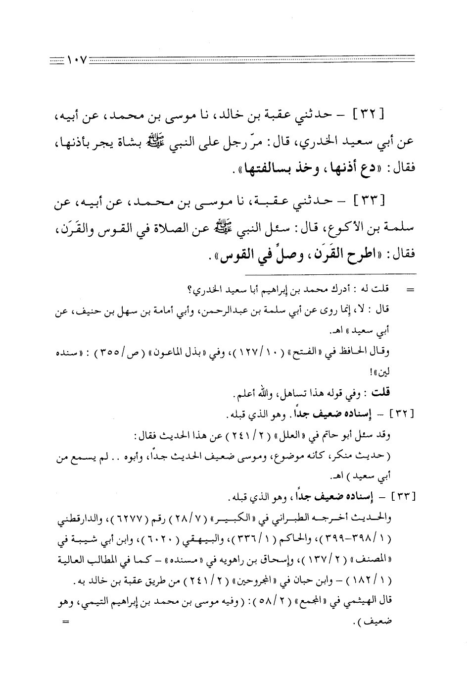33 - حدثني عقبة نا موسى بن محمد عن أبيه عن سلمة بن الأكوع قال سئل النبي صلى الله عليه وسلم عن الصلاة في القوس والقرن فقال اطرح القرن وصل في القوس