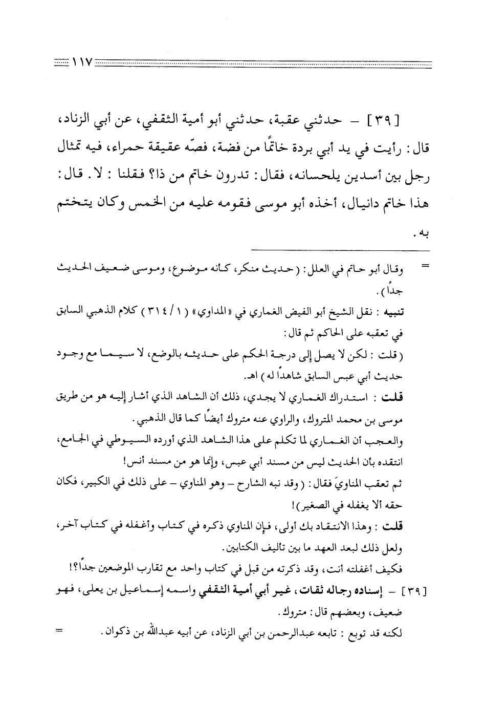 39 - حدثني عقبة حدثني أبو أمية الثقفي عن أبي الزناد قال رأيت في يد أبي بردة خاتماً من فضة فصه عقيقة حمراء فيه تمثال رجل بين أسدين يلحسانه فقال تدرون خاتم من ذا فقلنا لا قال هذا خاتم دانيال أخذه أبو موسى فقومه عليه من الخمس وكان يتختم به