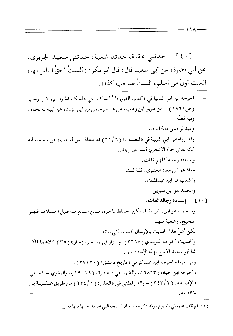 40 - حدثني عقبة حدثنا شعبة حدثني سعيد الجريري عن أبي نضرة عن أبي سعيد قال قال أبو بكر ألست أحق الناس بها ألست أول من أسلم ألست صاحب كذا