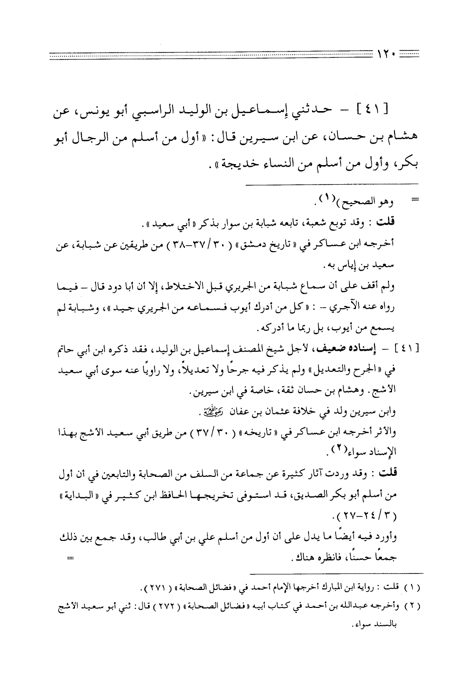 41 - حدثني إسماعيل بن الوليد الراسبي أبو يونس عن هشام بن حسان عن ابن سيرين قال أول من أسلم من الرجال أبو بكر وأول من أسلم من النساء خديجة