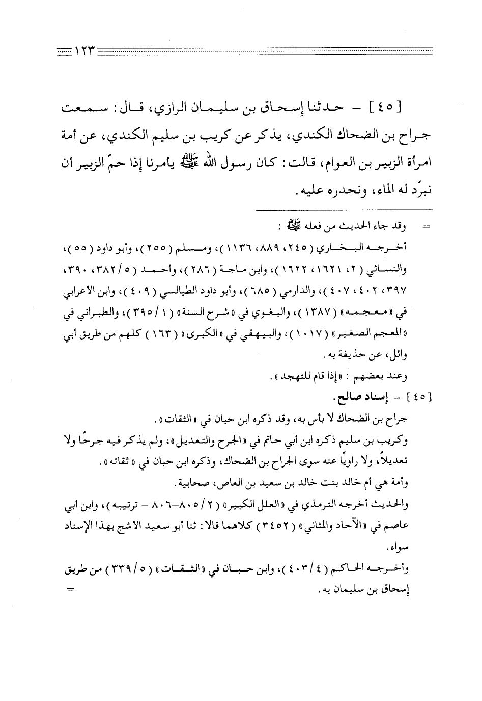 45 - حدثنا إسحاق بن سليمان الرازي قال سمعت جراح بن الضحاك الكندي يذكر عن كريب بن سليم الكندي عن أمة امرأة الزبير بن العوام قالت كان رسول الله صلى الله عليه وسلم يأمرنا إذا حم الزبير أن نبرد له الماء ونحدره عليه