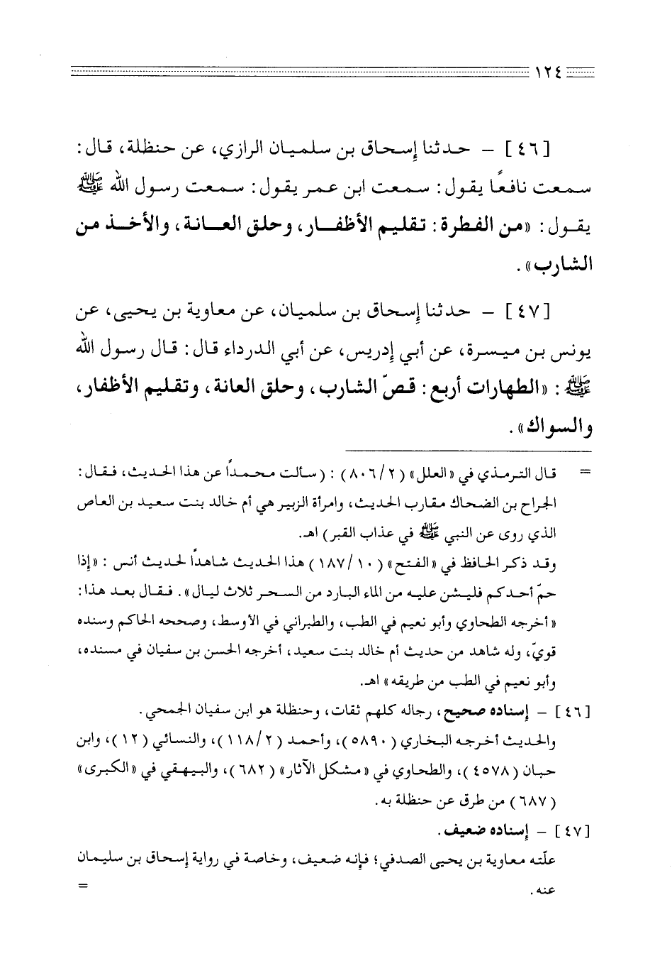 46 - حدثنا إسحاق بن سليمان الرازي عن حنظلة قال سمعت نافعاً يقول سمعت ابن عمر يقول سمعت رسول الله صلى الله عليه وسلم يقول من الفطرة تقليم الأظفار وحلق العانة والأخذ من الشارب