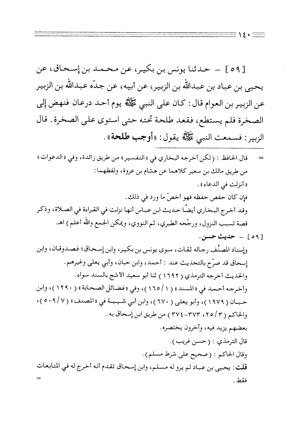 59 - حدثنا يونس بن بكير عن محمد بن إسحاق عن يحيى بن عباد بن عبد الله بن الزبير عن أبيه عن جده عبد الله بن الزبير عن الزبير بن العوام قال كان على النبي صلى الله عليه وسلم يوم أحد درعان فنهض إلى الصخرة فلم يستطع فقعد طلحة تحته حتى استوى على الصخرة قال الزبير فسمعت النبي صلى الله عليه وسلم يقول أوجب طلحة
