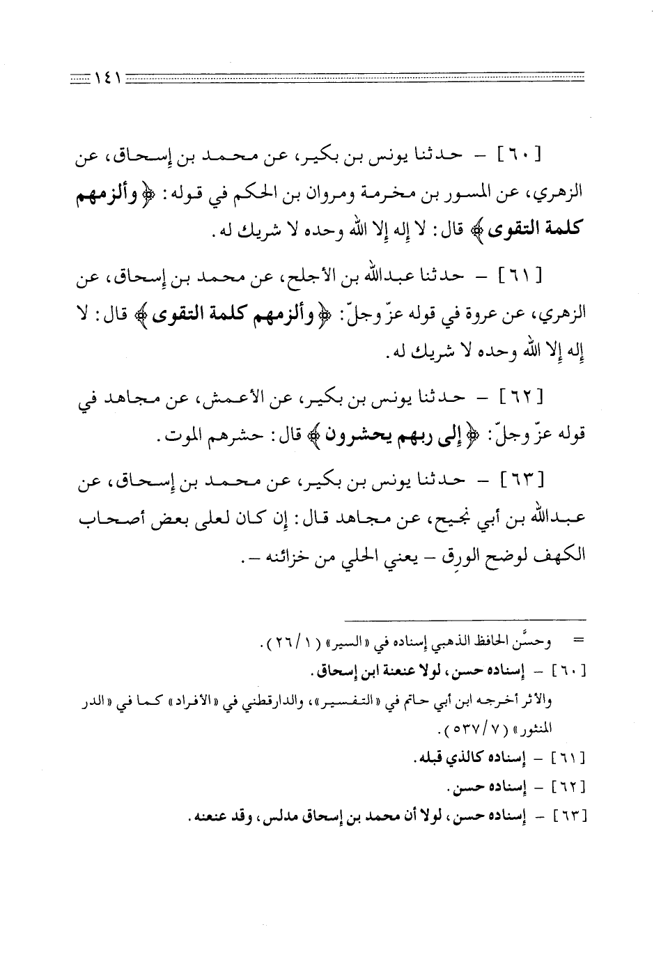 61 - حدثنا عبد الله بن الأجلح عن محمد بن إسحاق عن الزهري عن عروة في قوله عز وجل {وَأَلْزَمَهُمْ كَلِمَةَ التَّقْوَى} قال لا إله إلا الله وحده لا شريك له
