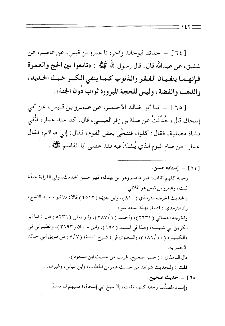 64 - حدثنا أبو خالد وآخر نا عمرو بن قيس عن عاصم عن شقيق عن عبد الله قال قال رسول الله صلى الله عليه وسلم تابعوا بين الحج والعمرة فإنهما ينفيان الفقر والذنوب كما ينفي الكير خبث الحديد والذهب والفضة وليس للحجة المبرورة ثواب دون الجنة