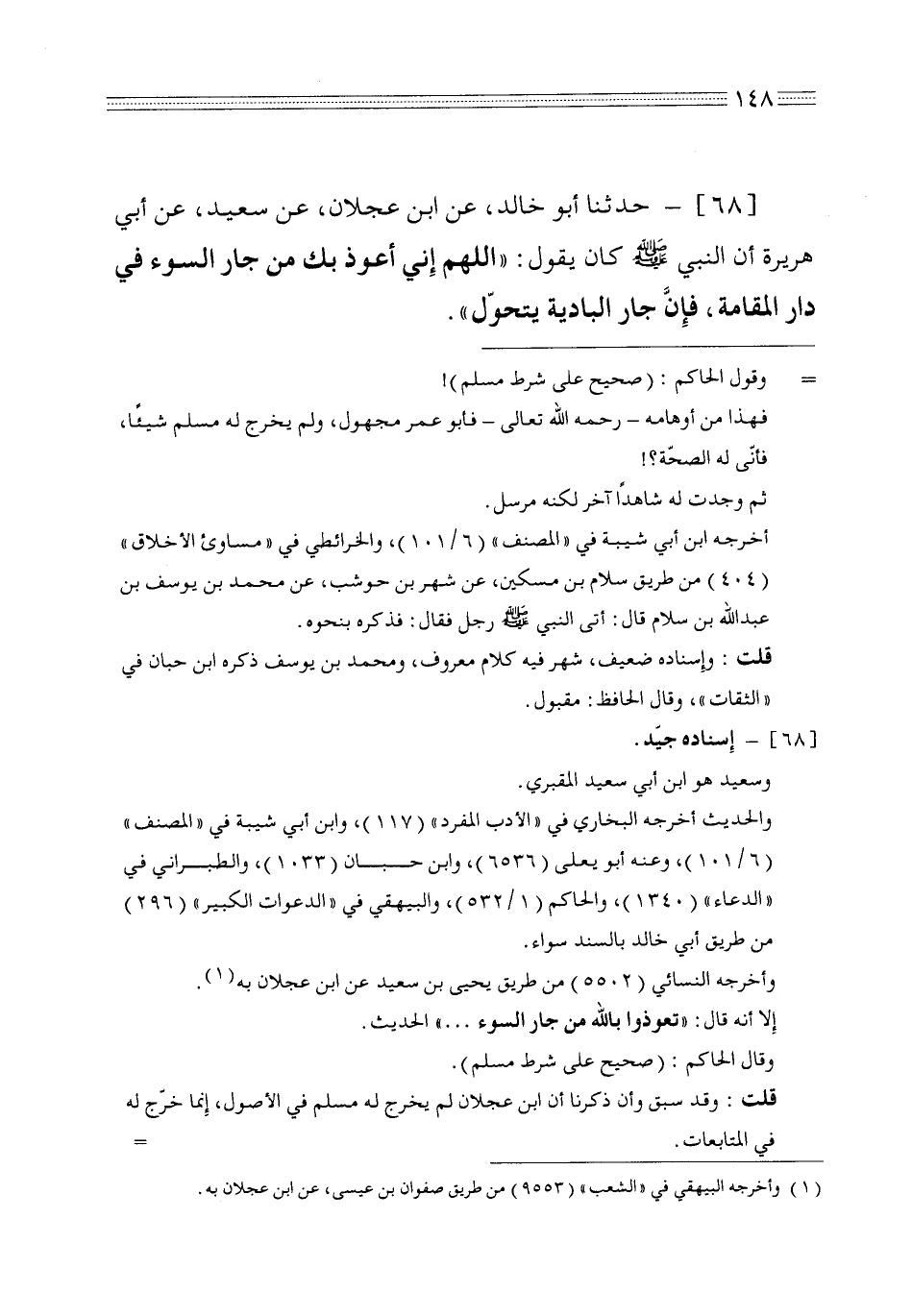 68 - حدثنا أبو خالد عن ابن عجلان عن سعيد عن أبي هريرة أن النبي صلى الله عليه وسلم كان يقول اللهم إني أعوذ بك من جار السوء في دار المقامة فإن جار البادية يتحول