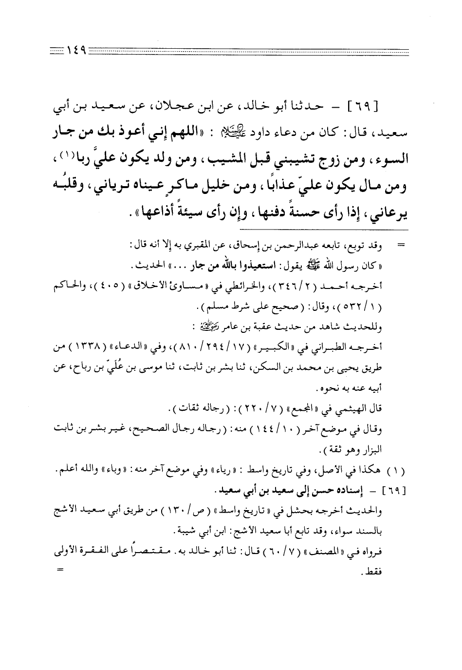 69 - حدثنا أبو خالد عن ابن عجلان عن سعيد بن أبي سعيد قال كان من دعاء داود عليه السلام اللهم إني أعوذ بك من جار السوء ومن زوج تشيبني قبل المشيب ومن ولد يكون علي ربا (¬1) ومن مال يكون علي عذاباً ومن خليل ماكرٍ عيناه ترياني وقلبه يرعاني إذا رأى حسنة دفنها وإن رأى سيئة أذاعها