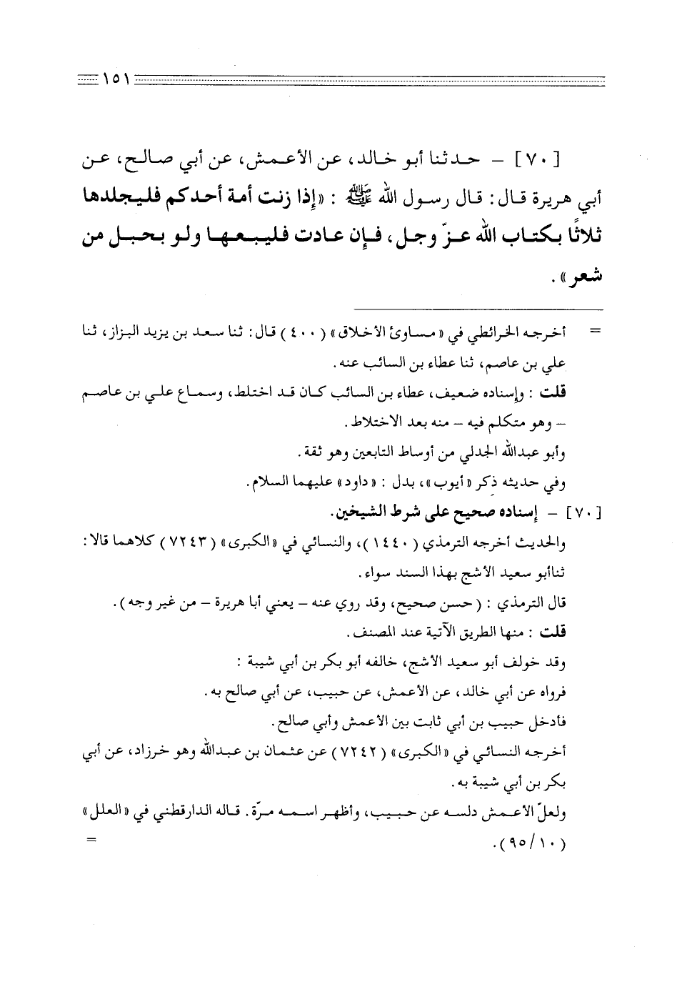 70 - حدثنا أبو خالد عن الأعمش عن أبي صالح عن أبي هريرة قال قال رسول الله صلى الله عليه وسلم إذا زنت أمة أحدكم فليجلدها ثلاثاً بكتاب الله عز وجل فإن عادت فليبعها ولو بحبل من شعر