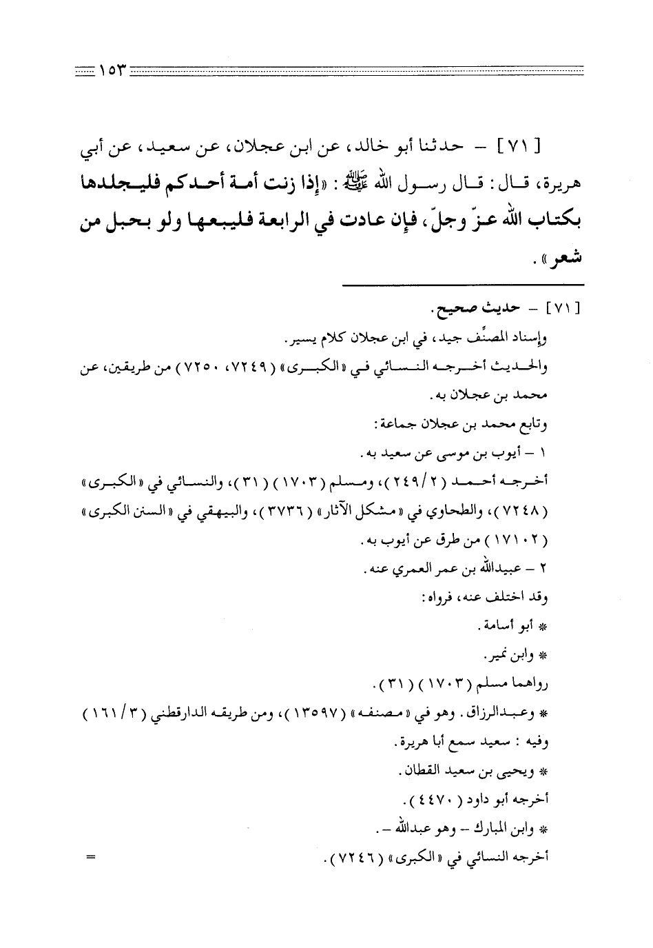 71 - حدثنا أبو خالد عن ابن عجلان عن سعيد عن أبي هريرة قال قال رسول الله صلى الله عليه وسلم إذا زنت أمة أحدكم فليجلدها بكتاب الله عز وجل فإن عادت في الرابعة فليبعها ولو بحبل من شعر