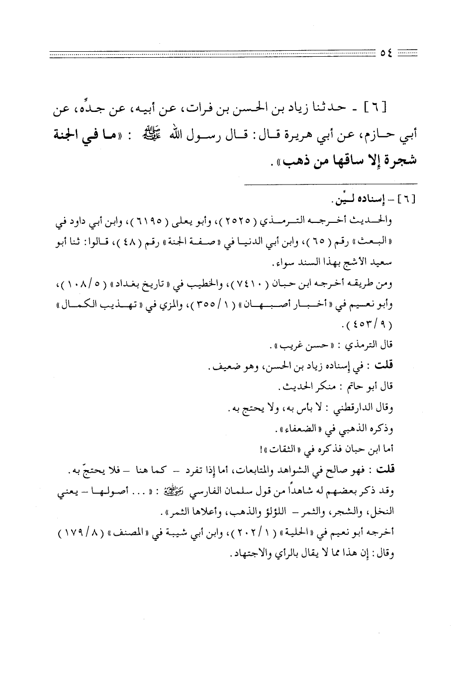 6 - حدثنا زياد بن الحسن بن فرات عن أبيه عن جده عن أبي حازم عن أبي هريرة قال قال رسول الله صلى الله عليه وسلم ما في الجنة شجرة إلا ساقها من ذهب