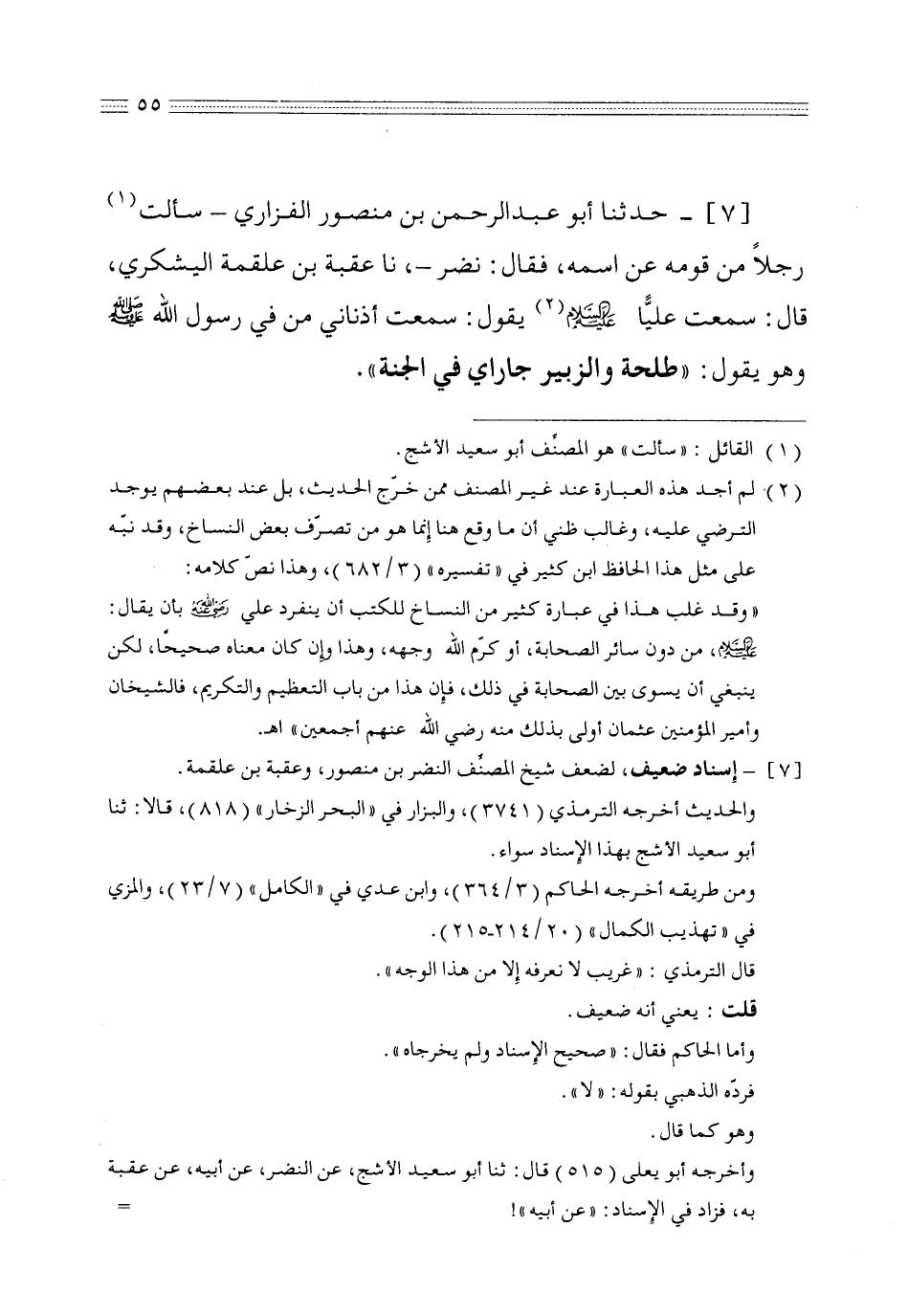 7 - حدثنا أبو عبد الرحمن بن منصور الفزاري سألت رجلاً من قومه عن اسمه فقال نضر نا عقبة بن علقمة اليشكري قال سمعت عليا عليه السلام يقول سمعت أذناني من في رسول الله صلى الله عليه وسلم وهو يقول طلحة والزبير جاراي في الجنة